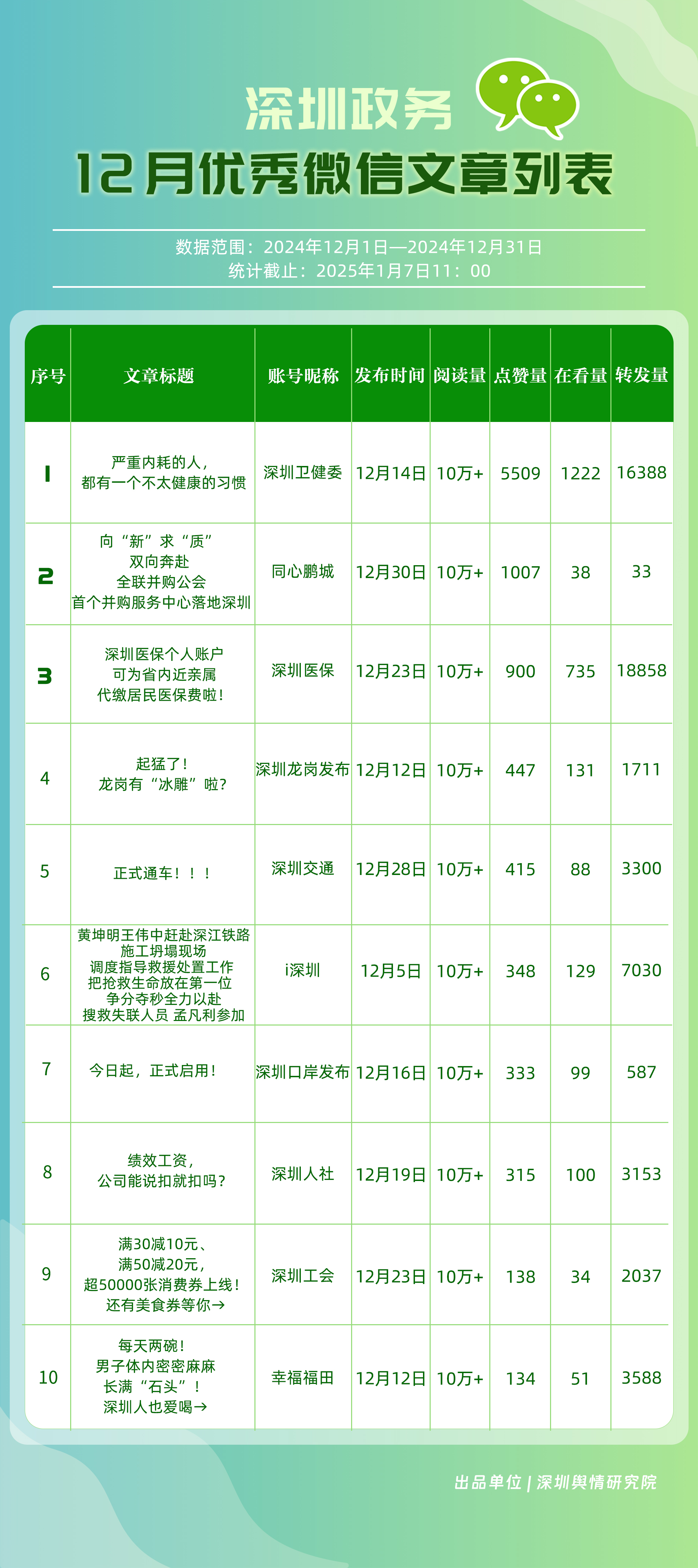 12月,“深圳衛(wèi)健委”“幸福福田”“深圳龍崗發(fā)布”“i深圳”“創(chuàng)新南山”“深圳光明”“濱海寶安”“青春深圳”“羅湖發(fā)布”“深圳龍華”等30個(gè)賬號(hào)入選“深圳優(yōu)秀政務(wù)微信公眾號(hào)”。其中,“深圳衛(wèi)健委”位于榜單首位,總分為100分?!靶腋8L铩薄吧钲诠饷鳌薄盀I海寶安”“羅湖發(fā)布”排名在本期有所提升,展現(xiàn)了他們不斷提升的傳播力、影響力?!癷深圳”“創(chuàng)新南山”則保持了穩(wěn)定的排名,持續(xù)在政務(wù)信息宣傳中發(fā)揮著重要作用。