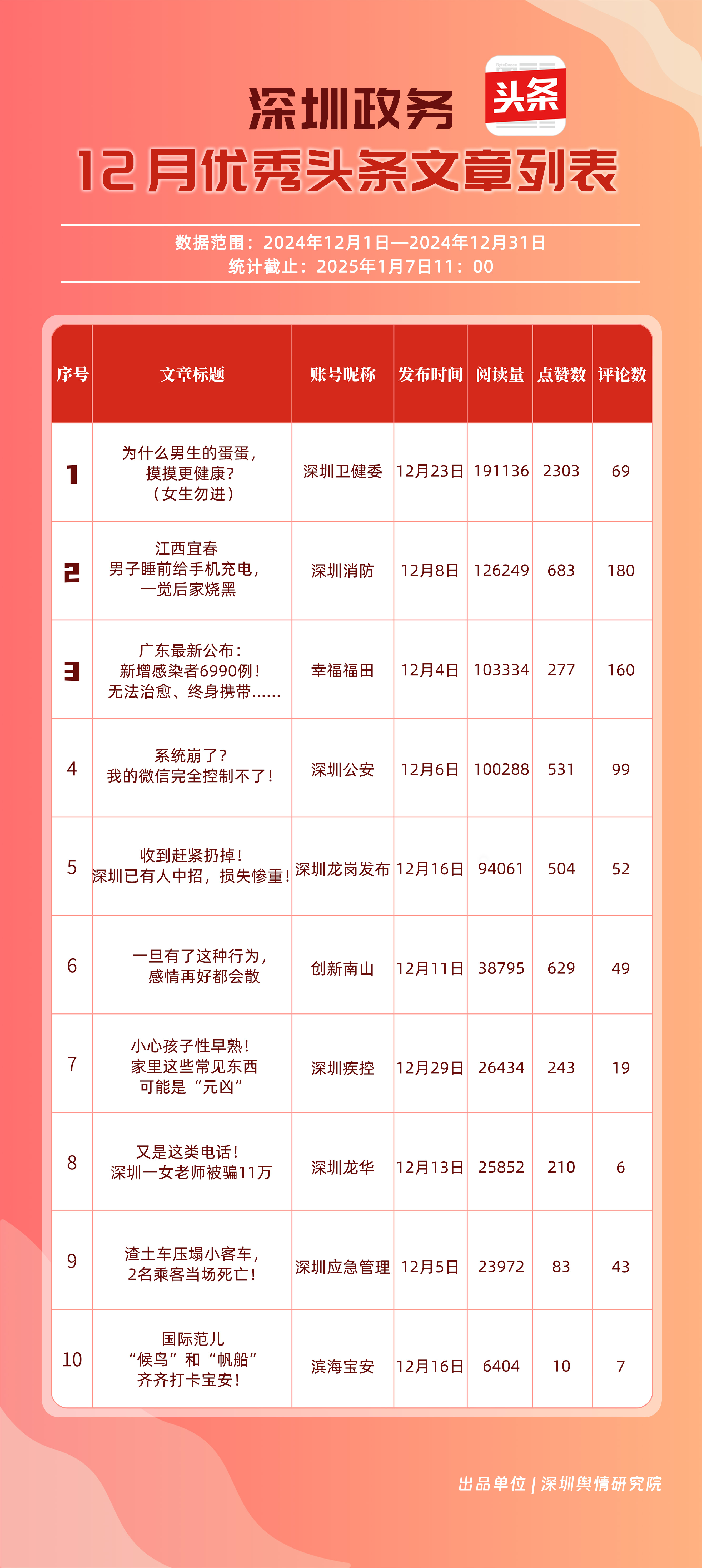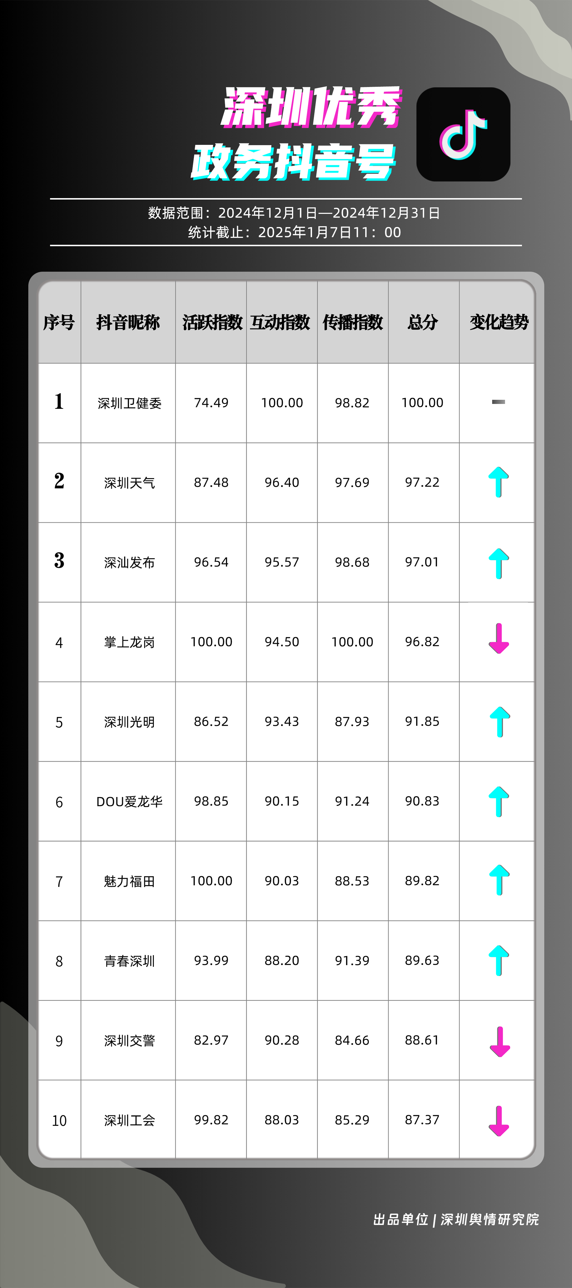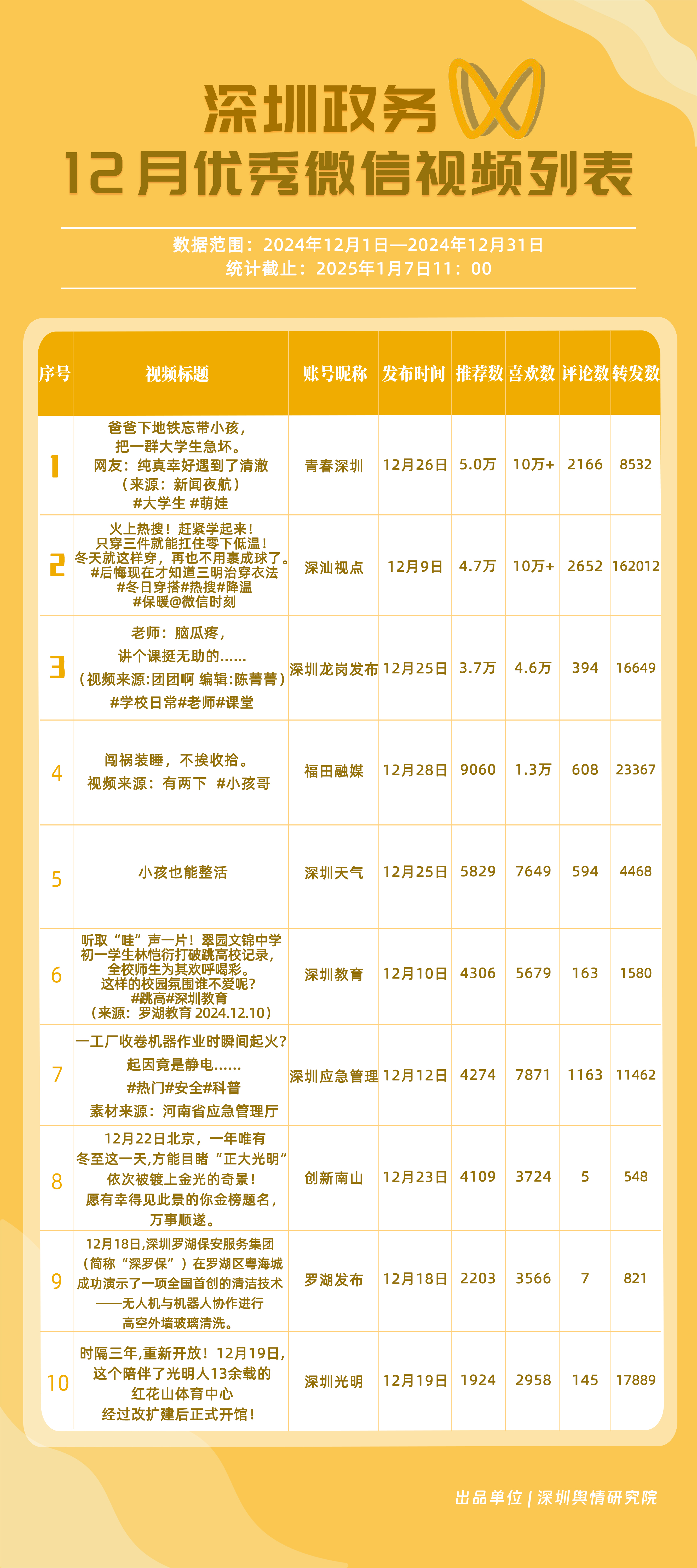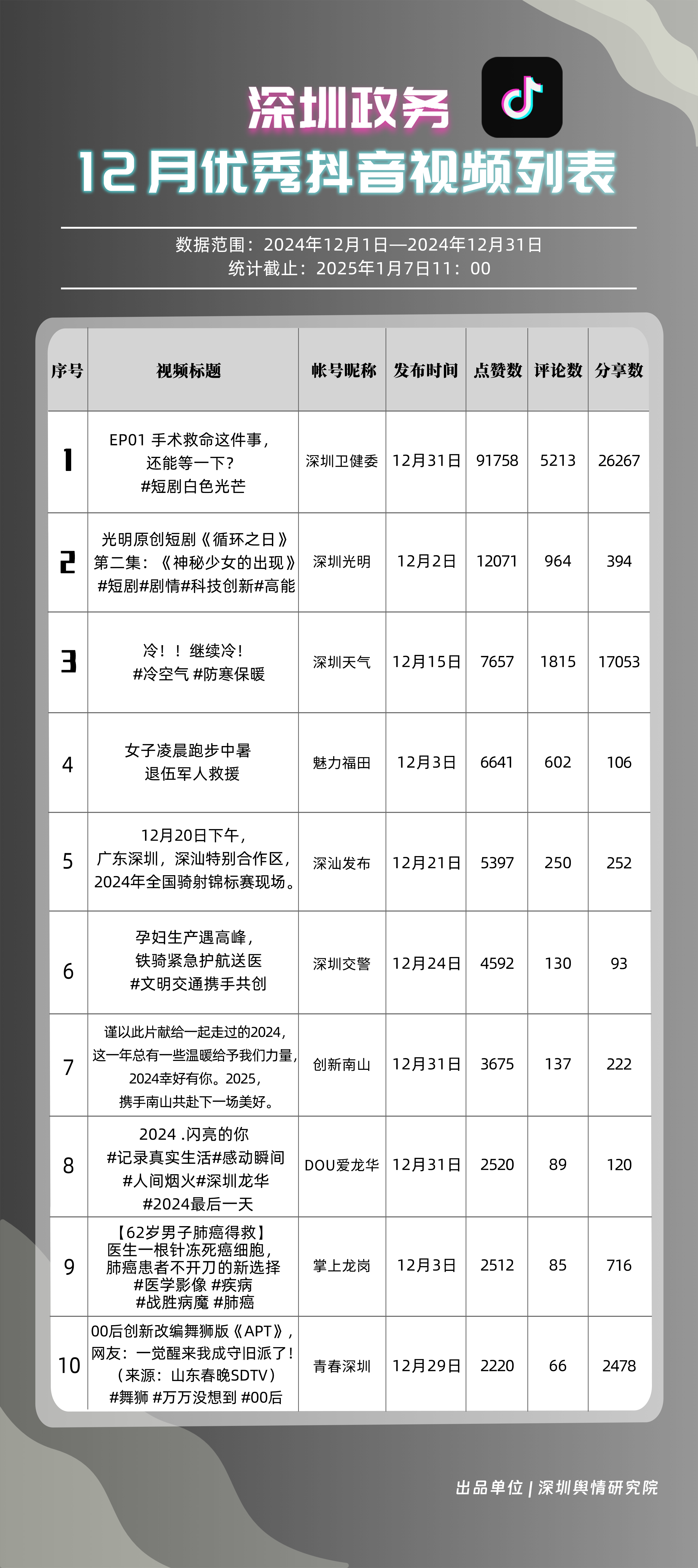 12月,“深圳衛(wèi)健委”“深圳天氣”“深汕發(fā)布”“掌上龍崗”“深圳光明”“DOU愛龍華”“魅力福田”“青春深圳”“深圳交警”“深圳工會(huì)”共10個(gè)政務(wù)抖音號(hào)獲得“深圳優(yōu)秀政務(wù)抖音號(hào)”稱號(hào)?!吧钲谛l(wèi)健委”在互動(dòng)、傳播方面成績(jī)優(yōu)異,助推其位于榜單首位?!吧钲谔鞖狻薄吧钌前l(fā)布”“掌上龍崗”則各有所長(zhǎng),綜合排名位于榜單前列,內(nèi)容產(chǎn)出豐富、用戶互動(dòng)高頻,信息傳播廣泛,共同展現(xiàn)了政務(wù)抖音號(hào)在服務(wù)公眾、提升信息傳播效能方面的顯著效能。