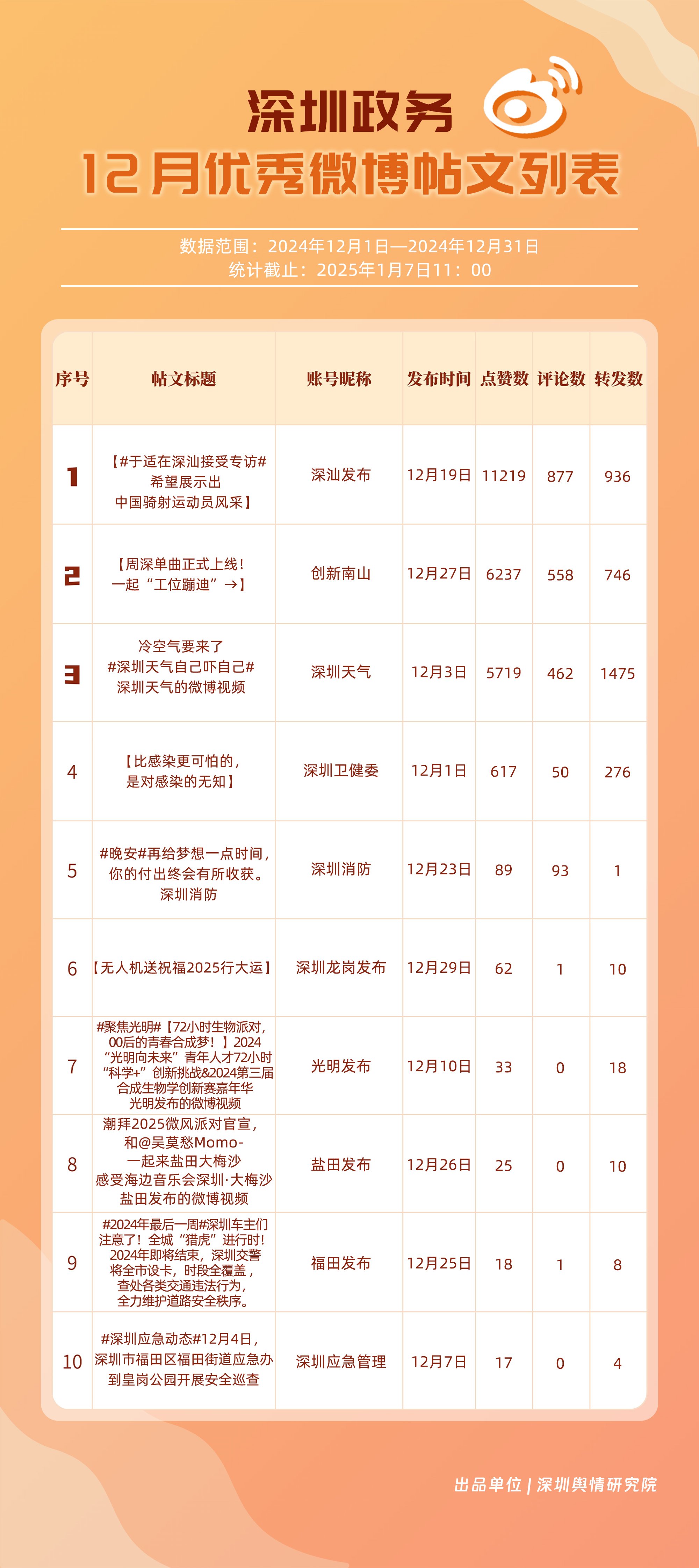 12月,“深圳天氣”“深圳消防”“深汕發(fā)布”“深圳衛(wèi)健委”“創(chuàng)新南山”“深圳龍崗發(fā)布”“深圳應(yīng)急管理”“深圳市城市管理和綜合執(zhí)法局”“深圳公安”“光明發(fā)布”等20個(gè)賬號(hào)入選“優(yōu)秀政務(wù)微博號(hào)”?!吧钲谔鞖狻鲍@得滿分,“深圳消防”“深汕發(fā)布”賬號(hào)總分均超95分,位于榜單前三名。同時(shí),“深圳衛(wèi)健委”“創(chuàng)新南山”“深圳龍崗發(fā)布”及“深圳應(yīng)急管理”等賬號(hào)憑借對(duì)熱點(diǎn)的敏銳捕捉與信息的及時(shí)發(fā)布,總分在90分以上,體現(xiàn)出各自在提升公眾信息獲取質(zhì)量方面的不懈努力,彰顯了政務(wù)微博賬號(hào)在政民連接、信息共享等方面的巨大價(jià)值。