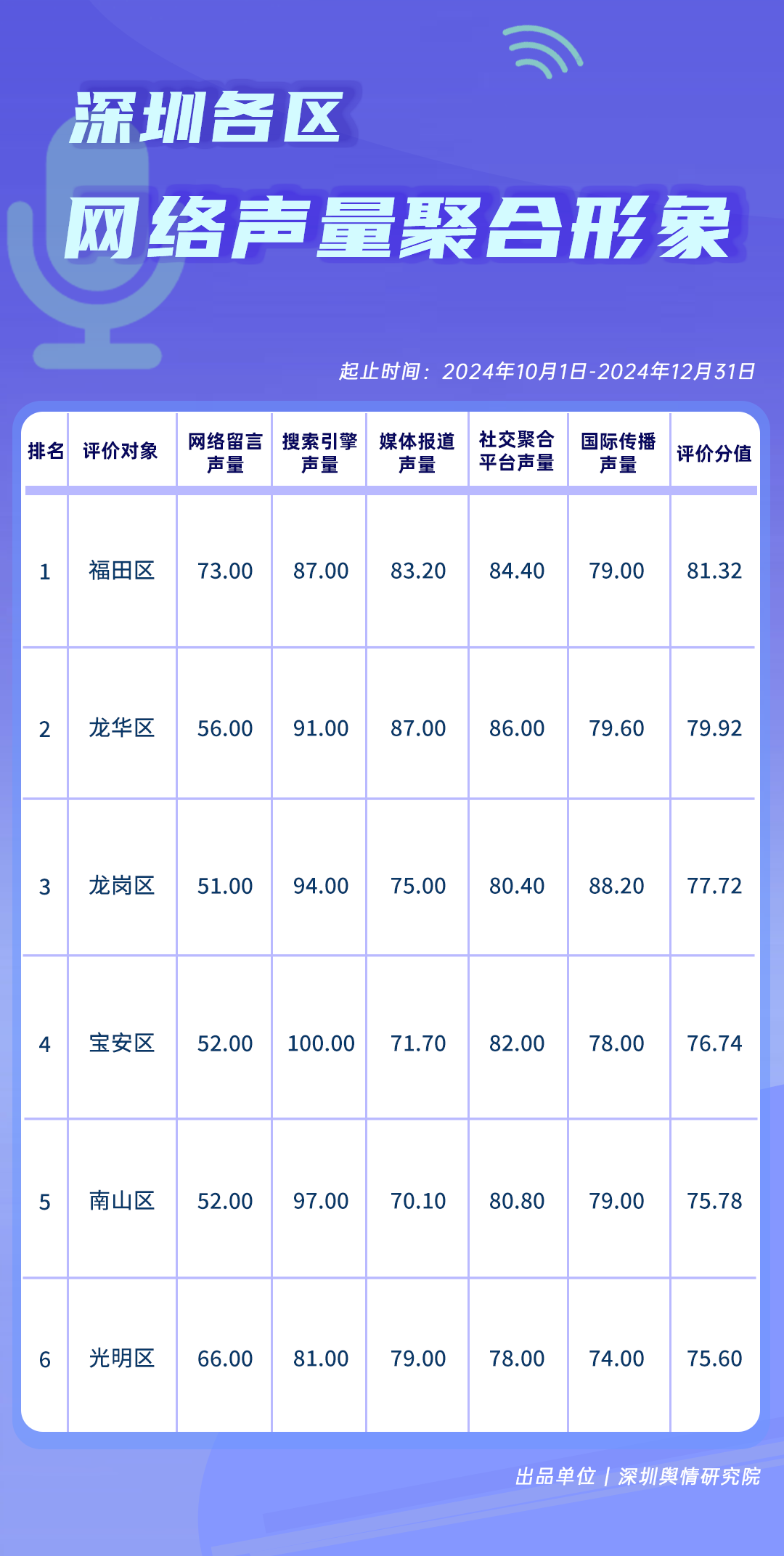 為全面評估深圳各區(qū)各單位網(wǎng)絡形象建設情況,助力各區(qū)各單位持續(xù)響應居民對美好生活的期許,賦能城市高質量發(fā)展,深圳輿情研究院推出“深圳各區(qū)各單位網(wǎng)絡形象建設榜”,從網(wǎng)絡聚合聲量、留言互動成效、社會生活評價、輿情管理能力及新媒體傳播水平等方面,多維度分析深圳各區(qū)(含大鵬新區(qū)、深汕特別合作區(qū))、各市直單位(市直屬單位、直屬部門)的網(wǎng)絡形象建設成果,凸顯各區(qū)各單位的“共性”與“個性”。