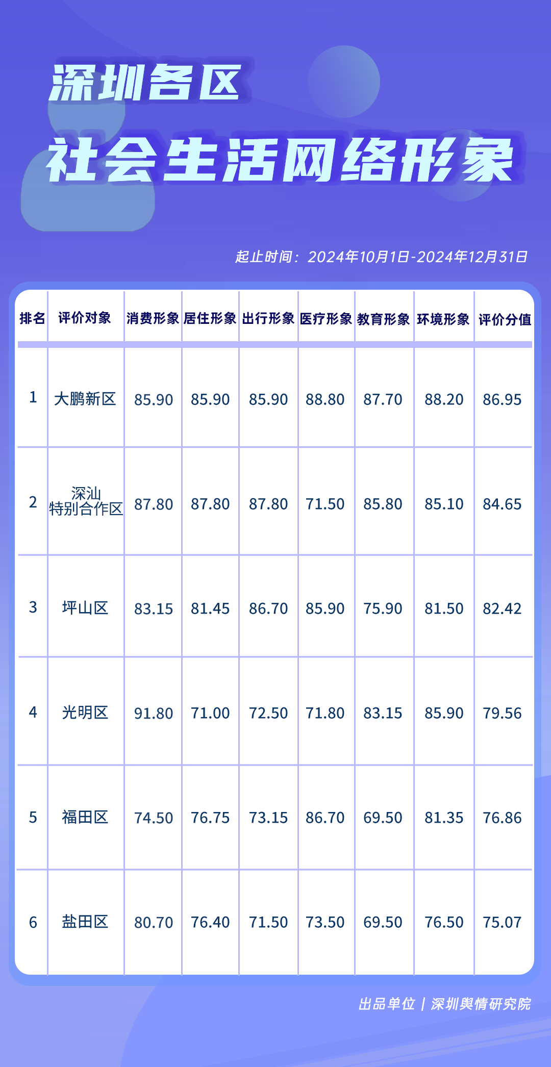 10-12月,《深圳各區(qū)社會生活網(wǎng)絡形象榜》中,大鵬新區(qū)、深汕特別合作區(qū)、坪山區(qū)綜合評價分值在80分以上,表現(xiàn)優(yōu)異。光明區(qū)、福田區(qū)、鹽田區(qū)各有所長,分別占據(jù)了榜單第四至第六的位置,成為深圳各區(qū)致力于改善社會民生、促進區(qū)域協(xié)調發(fā)展的生動范例。