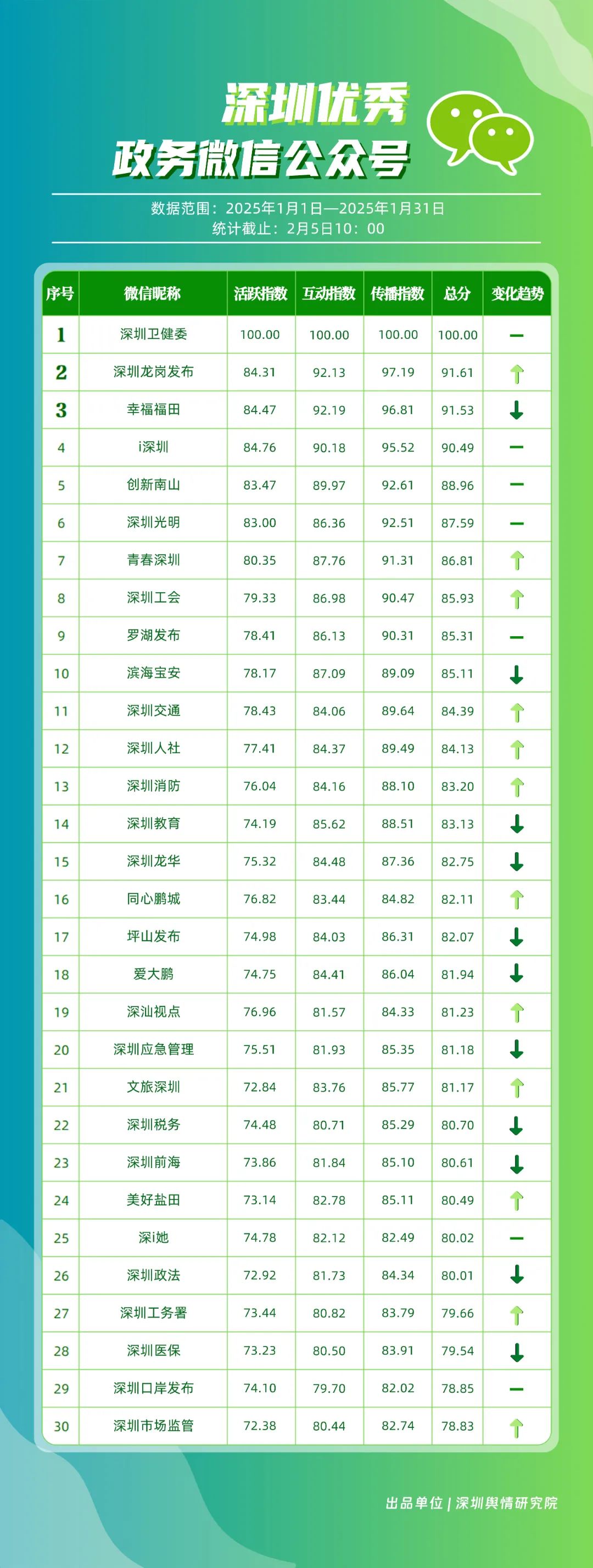 1月,“深圳衛(wèi)健委”“深圳龍崗發(fā)布”“幸福福田”“i深圳”“創(chuàng)新南山”“深圳光明”“青春深圳”“深圳工會(huì)”“羅湖發(fā)布”“濱海寶安”等30個(gè)賬號(hào)入選“深圳優(yōu)秀政務(wù)微信公眾號(hào)”。其中,“深圳衛(wèi)健委”各方面表現(xiàn)卓越,位于榜單首位,獲得總分100分。“深圳龍崗發(fā)布”“青春深圳”“深圳工會(huì)”排名在本期有所提升,反映了這些賬號(hào)在內(nèi)容創(chuàng)新與受眾互動(dòng)方面的不懈努力。“i深圳”“創(chuàng)新南山”“深圳光明”“羅湖發(fā)布”則保持了穩(wěn)健的排名,持續(xù)在政務(wù)信息的傳播中扮演著不可或缺的角色。