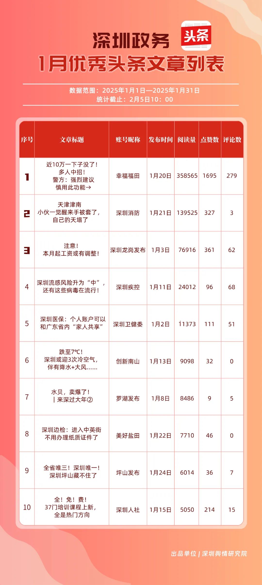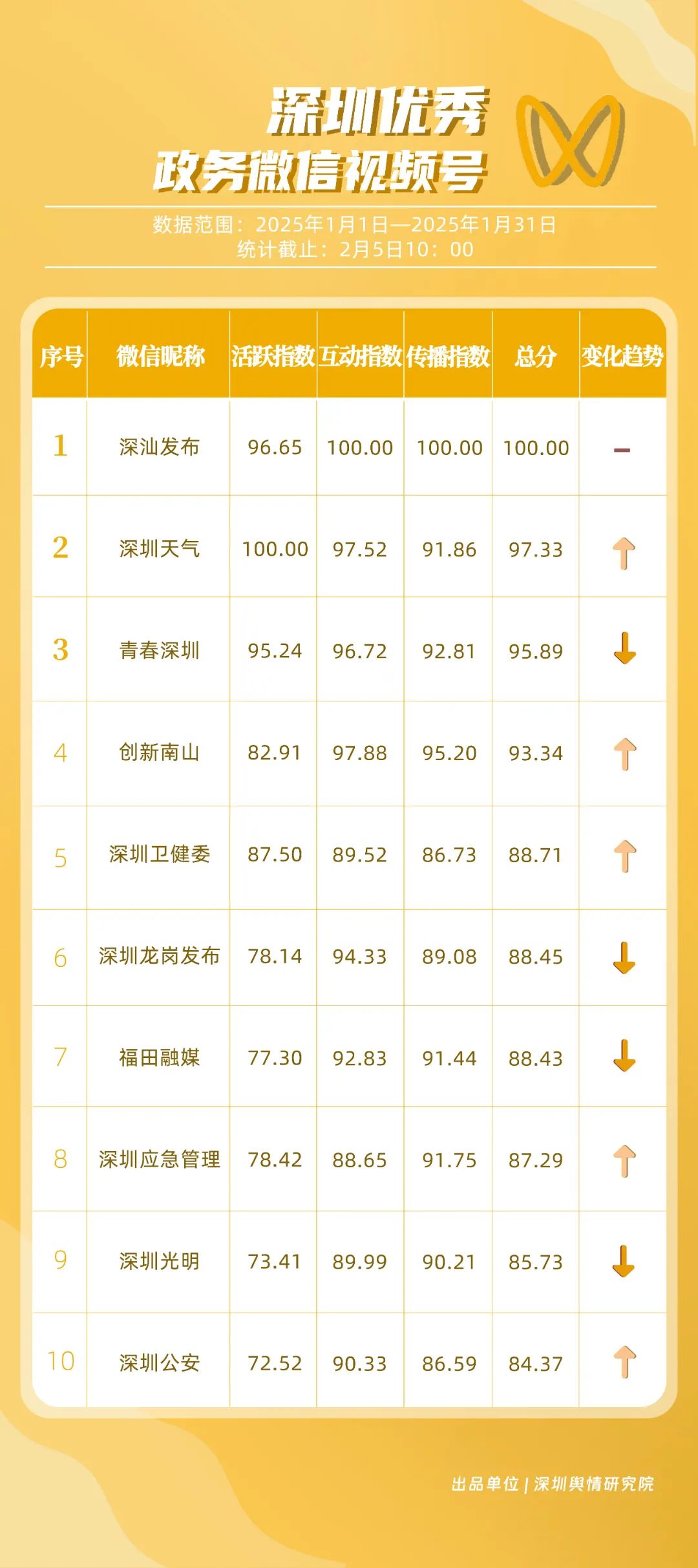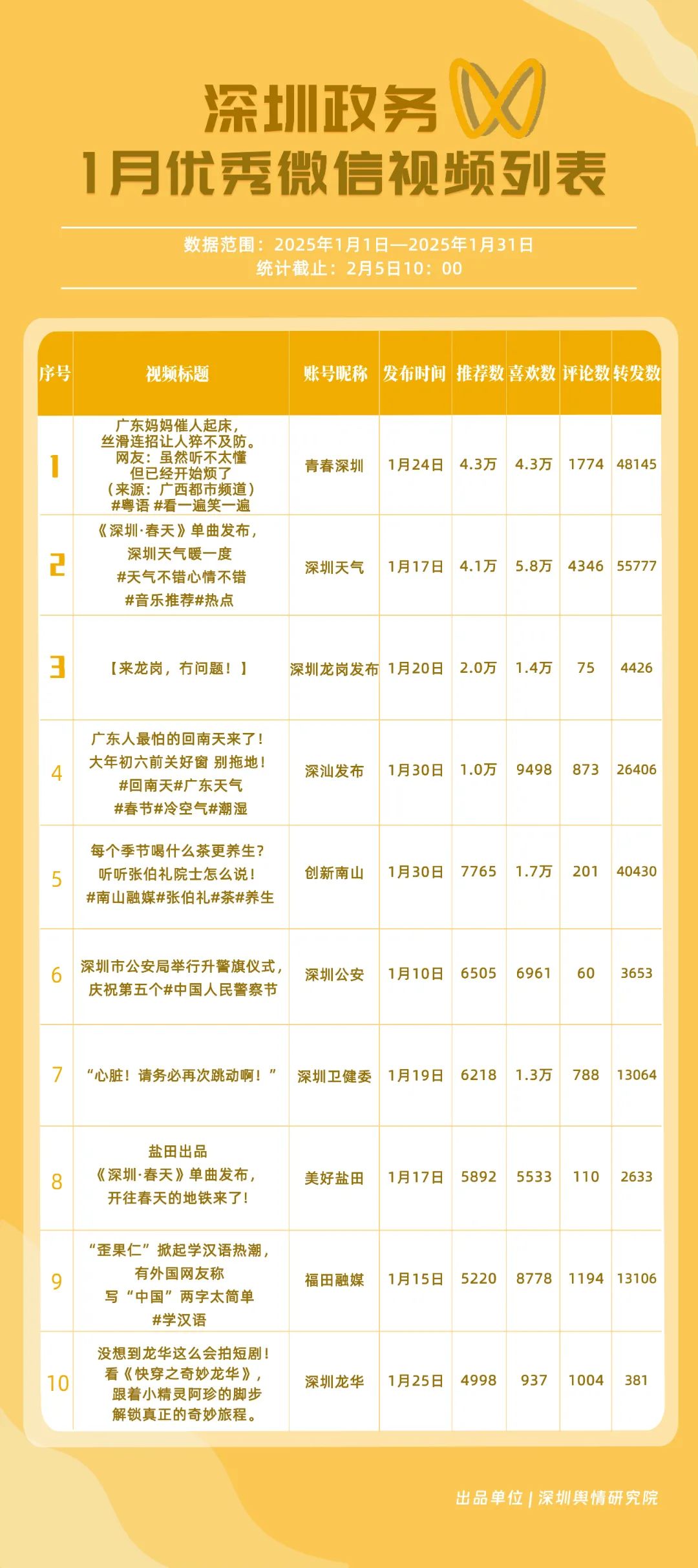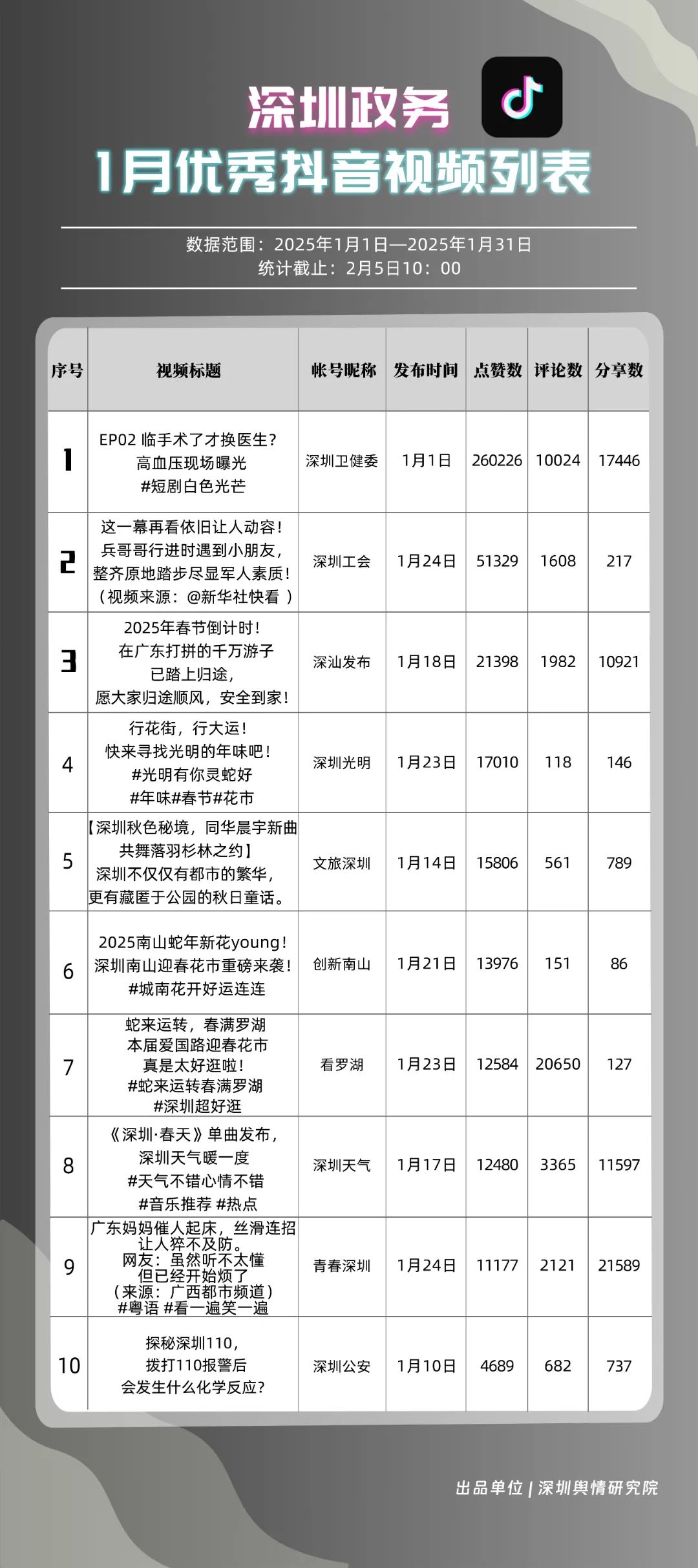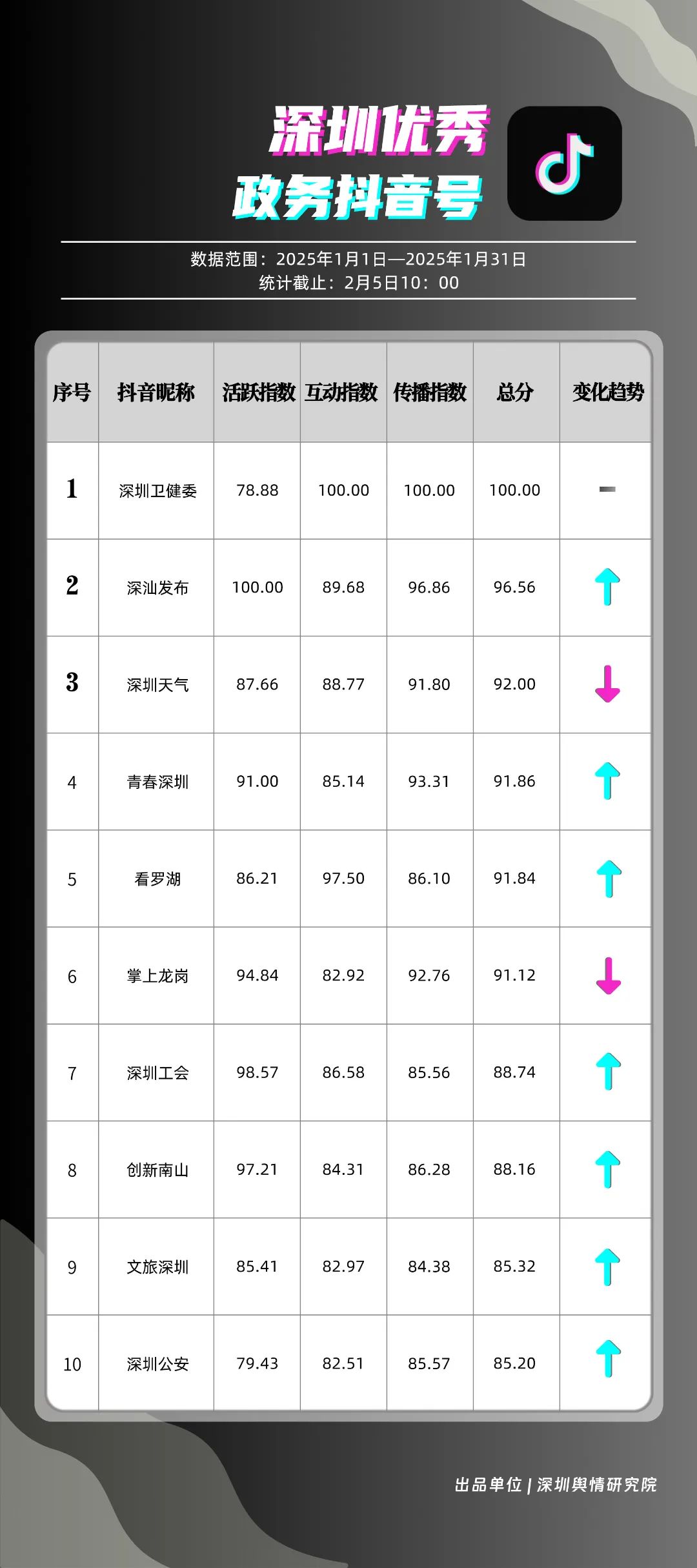 1月,“深圳衛(wèi)健委”“深汕發(fā)布”“深圳天氣”“青春深圳”“看羅湖”“掌上龍崗”“深圳工會(huì)”“創(chuàng)新南山”“文旅深圳”“深圳公安”共10個(gè)政務(wù)抖音號(hào)獲得“深圳優(yōu)秀政務(wù)抖音號(hào)”稱號(hào)?!吧钲谛l(wèi)健委”“深汕發(fā)布”“深圳天氣”成績優(yōu)異,綜合實(shí)力較強(qiáng),位于榜單前列?!扒啻荷钲凇薄翱戳_湖”等賬號(hào)排名有所提升,彰顯了這些賬號(hào)在拓寬受眾基礎(chǔ)、增強(qiáng)用戶黏性等方面所取得的積極成效。