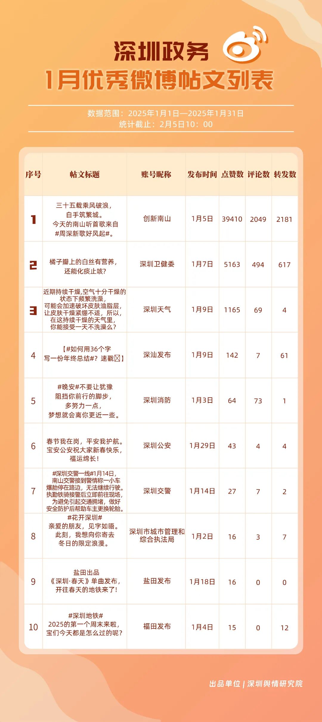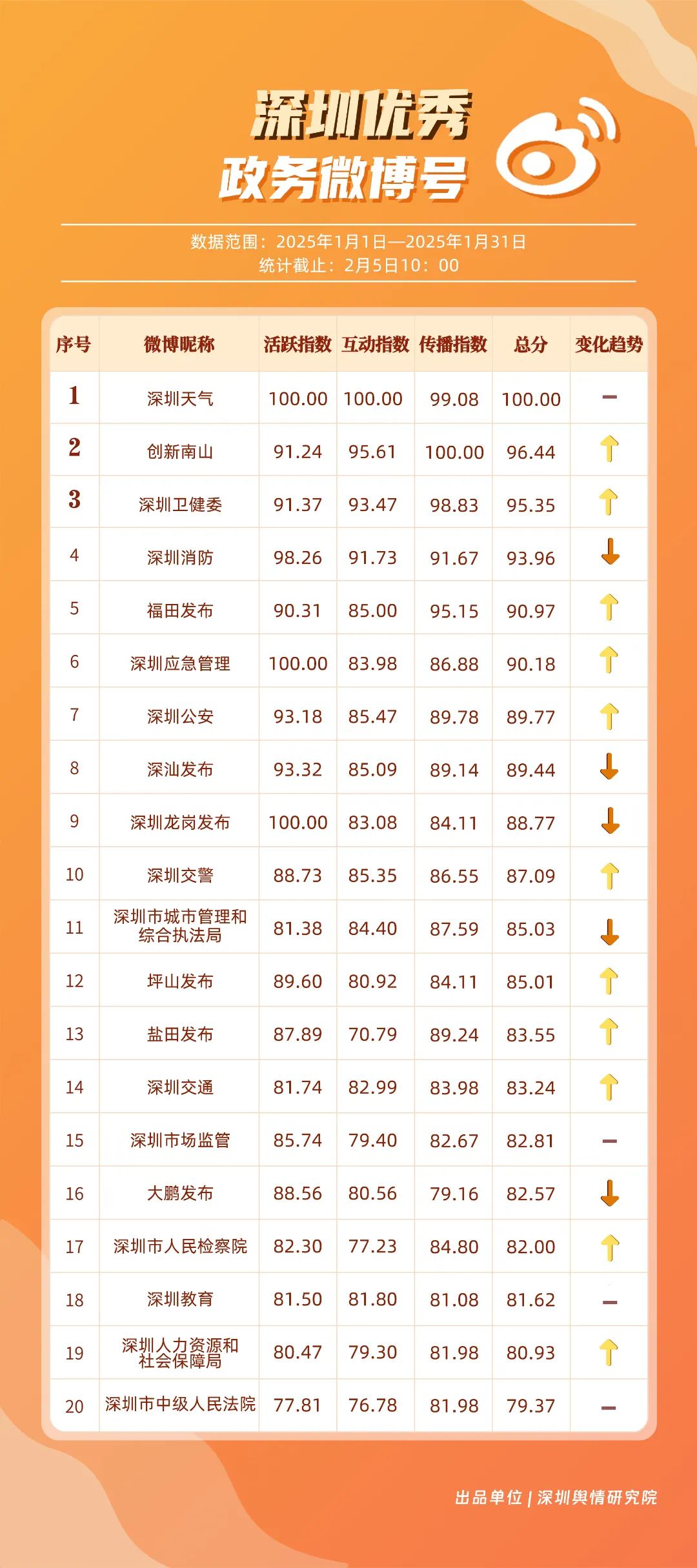 1月,“深圳天氣”“創(chuàng)新南山”“深圳衛(wèi)健委”“深圳消防”“福田發(fā)布”“深圳應(yīng)急管理”“深圳公安”“深汕發(fā)布”“深圳龍崗發(fā)布”“深圳交警”等20個(gè)賬號(hào)入選“優(yōu)秀政務(wù)微博號(hào)”?!吧钲谔鞖狻睉{借高活躍度、互動(dòng)量等獲得滿分,“創(chuàng)新南山”“深圳衛(wèi)健委”賬號(hào)則在1月發(fā)力宣傳,排名上升至榜單第二、三位。同時(shí),“深圳消防”“福田發(fā)布”“深圳應(yīng)急管理”賬號(hào)總分在90分以上,彰顯了他們在提升公眾安全意識(shí)、促進(jìn)政民互動(dòng)等方面所做出的積極貢獻(xiàn)。