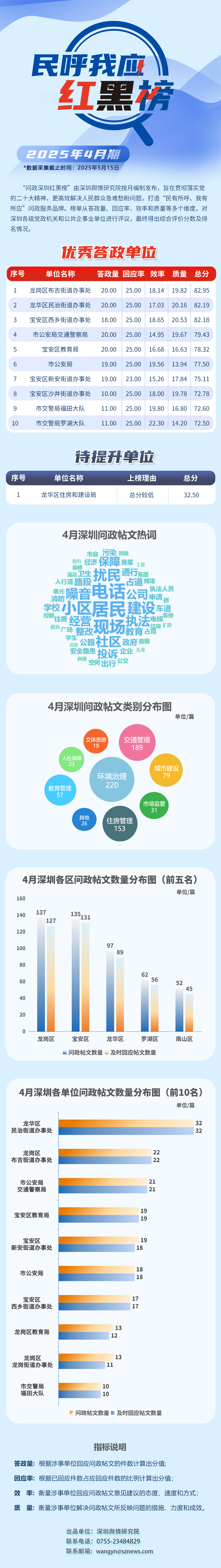 本期榜單采集的帖文主要來(lái)自深圳市及各區(qū)政府官網(wǎng)、深圳論壇、人民網(wǎng)領(lǐng)導(dǎo)留言板、深圳新聞網(wǎng)“民呼我應(yīng)”等平臺(tái),所采集帖文發(fā)布時(shí)間為2025年4月1日至4月30日,采集截止時(shí)間為2025年5月15日。