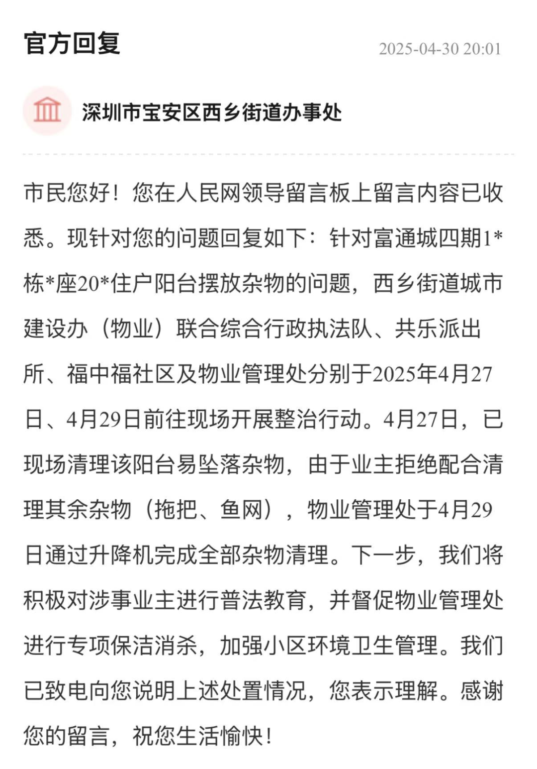 案例點(diǎn)評(píng):臭蟲侵?jǐn)_住戶問(wèn)題與居民生活舒適度息息相關(guān)。南山區(qū)城管部門快速響應(yīng),在問(wèn)題反饋后48小時(shí)內(nèi)即開展消殺,遏制臭蟲蔓延;同步強(qiáng)化環(huán)境整治,切斷滋生鏈條。更值得肯定的是,回應(yīng)中還表示將建立健全長(zhǎng)效監(jiān)測(cè)機(jī)制,動(dòng)態(tài)跟蹤蟲情并及時(shí)采取措施,充分體現(xiàn)出該局問(wèn)題發(fā)現(xiàn)快、處置措施實(shí)、長(zhǎng)效保障穩(wěn)的務(wù)實(shí)作風(fēng)。