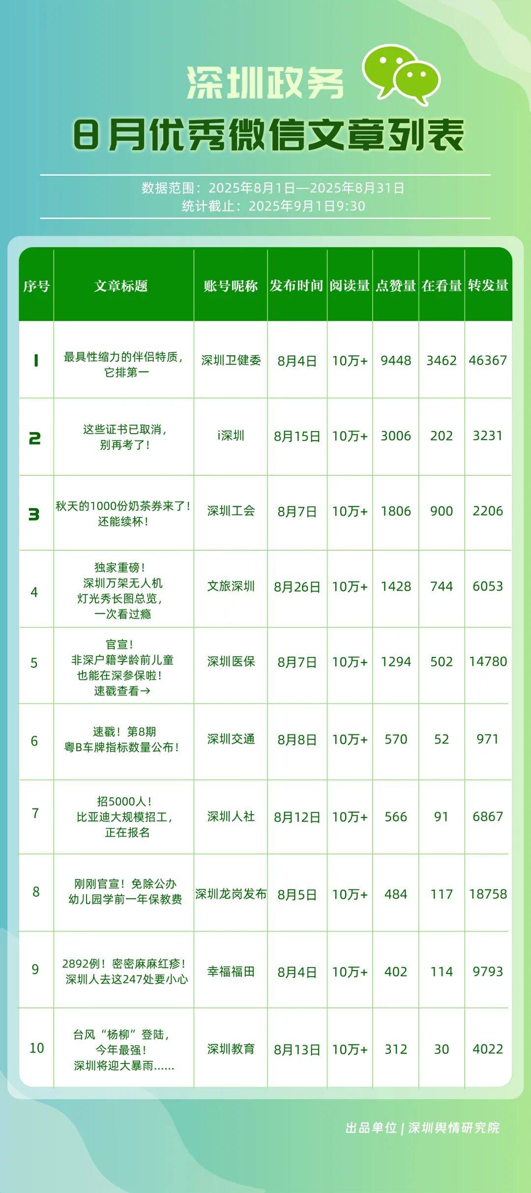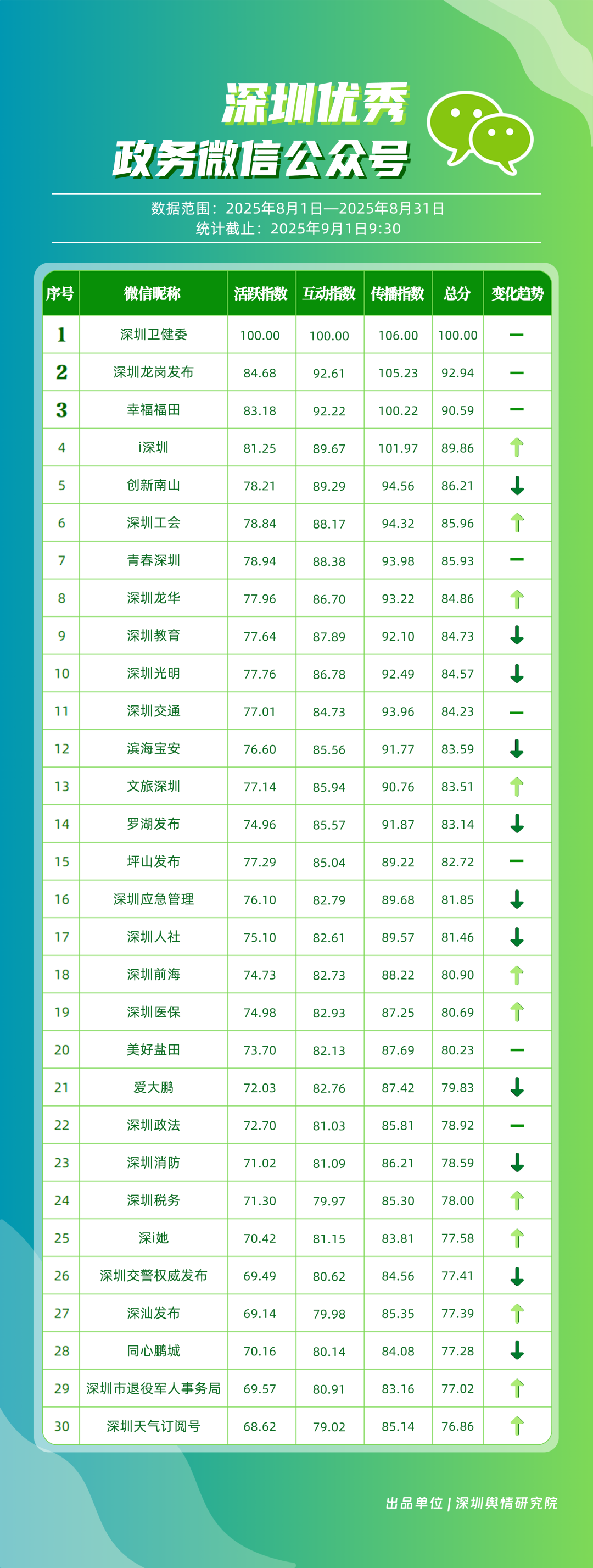 8月,30個政務(wù)微信公眾號入選“深圳優(yōu)秀政務(wù)微信公眾號”榜單,其中包括“深圳衛(wèi)健委”“深圳龍崗發(fā)布”“幸福福田”“i深圳”“創(chuàng)新南山”“深圳工會”“青春深圳”“深圳龍華”“深圳教育”“深圳光明”等。8月,“深圳衛(wèi)健委”66篇推文獲得超10萬次閱讀,以滿分位于榜單首位;“深圳龍崗發(fā)布”積極傳遞民生信息,依托區(qū)域活動開展宣傳,推動傳播效果顯著提升,位居第二;“幸福福田”關(guān)注區(qū)域發(fā)展動態(tài),排名第三?!癷深圳”“創(chuàng)新南山”“深圳工會”“青春深圳”等政務(wù)賬號在信息發(fā)布中不斷提升內(nèi)容豐富性,深耕優(yōu)質(zhì)服務(wù),評分在85分以上。上榜微信公眾號立足自身特色優(yōu)勢,以精品內(nèi)容為核心競爭力,在政務(wù)傳播領(lǐng)域樹立了標(biāo)桿形象,成為兼具影響力與公信力的示范樣本。
