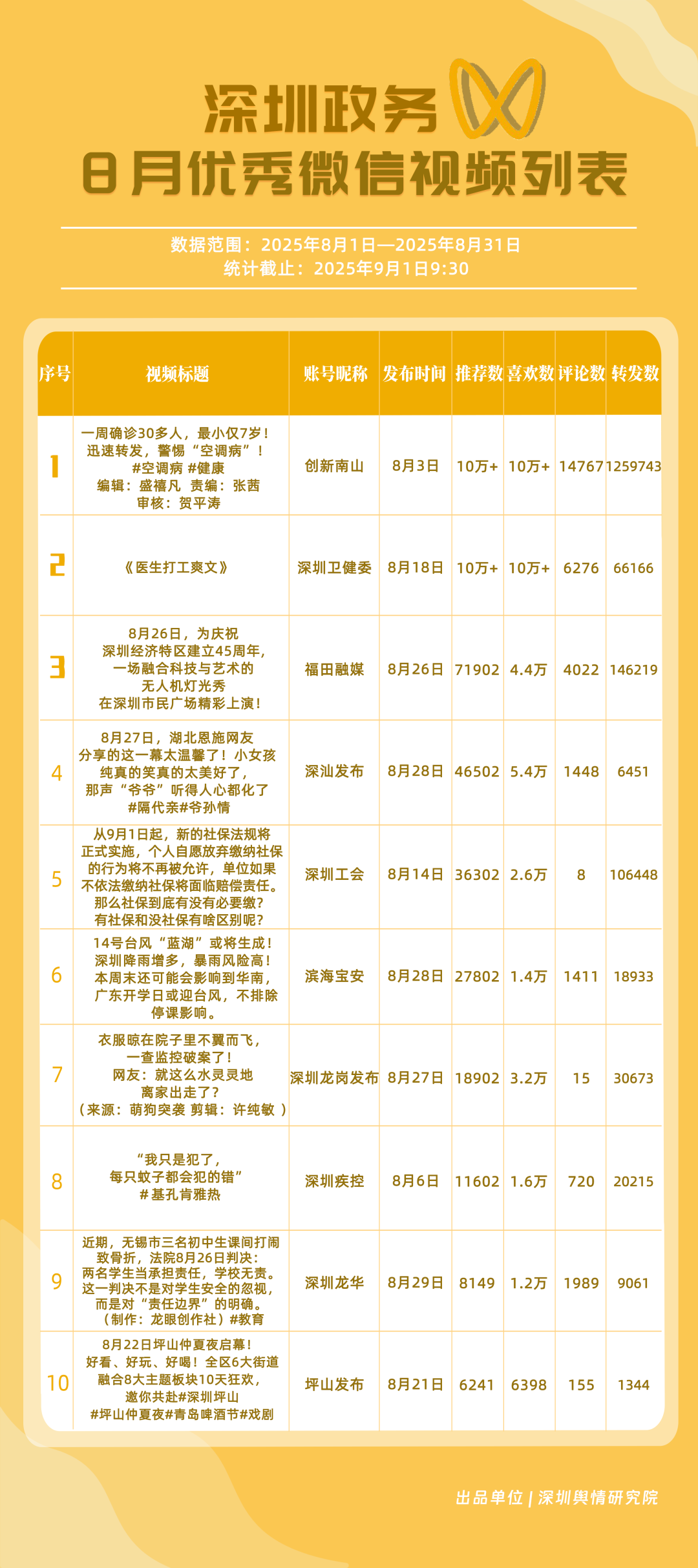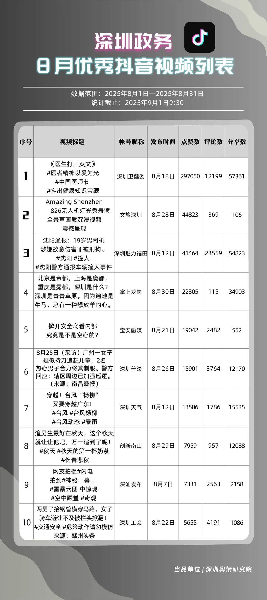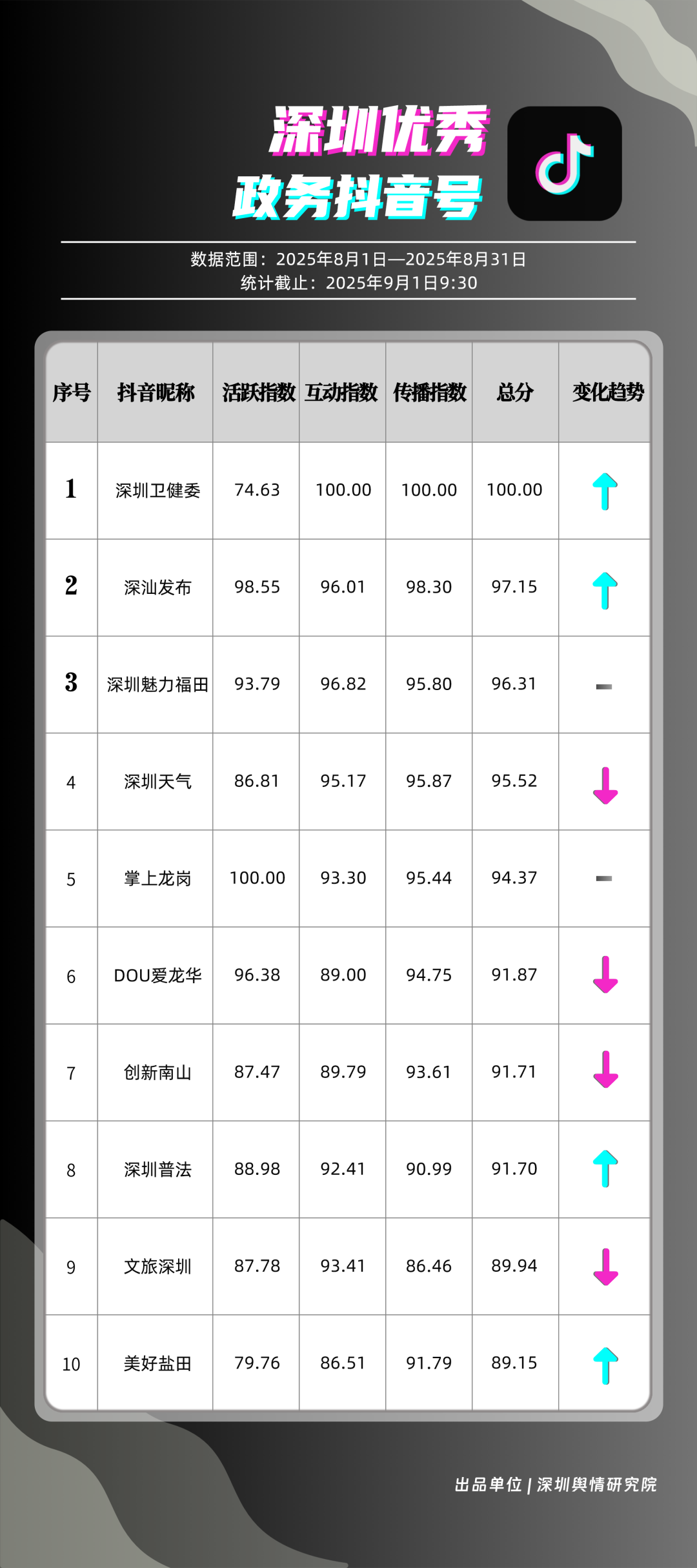 8月,“深圳衛(wèi)健委”“深汕發(fā)布”“深圳魅力福田”“深圳天氣”“掌上龍崗”“DOU愛龍華”“創(chuàng)新南山”“深圳普法”“文旅深圳”“美好鹽田”共10個政務(wù)抖音號獲得“優(yōu)秀政務(wù)抖音號”稱號?!吧钲谛l(wèi)健委”內(nèi)容吸引大量網(wǎng)民關(guān)注,4條視頻累計獲得超50萬次點贊,排名從上期的第九名上升至第一名;“深汕發(fā)布”憑借較高的傳播指數(shù)評分,位列第二名,排名有所上升?!吧钲邝攘ΩL铩薄吧钲谔鞖狻钡荣~號緊隨其后,得分均在95分左右。上榜的優(yōu)秀政務(wù)抖音號深耕優(yōu)質(zhì)創(chuàng)作,精準(zhǔn)把握網(wǎng)民興趣點,使作品收獲高點贊、高轉(zhuǎn)發(fā),推動評論區(qū)形成良性互動氛圍,以優(yōu)秀內(nèi)容提升政務(wù)傳播效能。