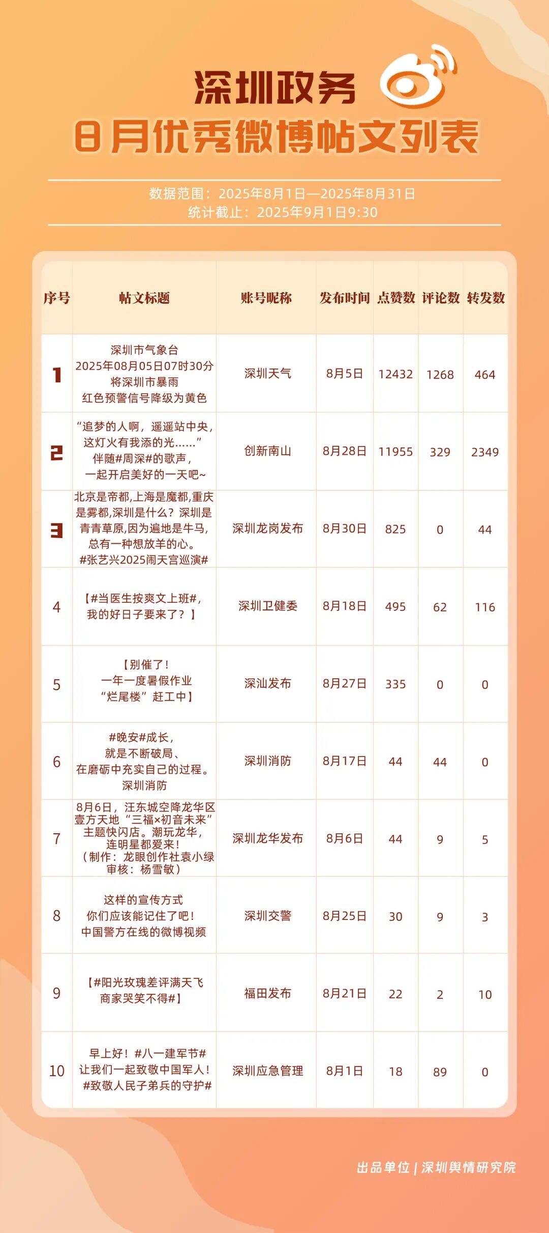8月,“深圳天氣”“創(chuàng)新南山”“深圳消防”“深圳衛(wèi)健委”“深圳龍崗發(fā)布”“福田發(fā)布”“深汕發(fā)布”“深圳公安”“深圳應(yīng)急管理”“深圳交警”等20個賬號入選“優(yōu)秀政務(wù)微博號”。其中,“深圳天氣”持續(xù)以優(yōu)質(zhì)內(nèi)容受到網(wǎng)民肯定,蟬聯(lián)榜首;“創(chuàng)新南山”傳播指數(shù)得分再提升,總分96.45,排名保持在第二位;“深圳消防”積極發(fā)布消防相關(guān)內(nèi)容,以93.25分位列第三。上榜優(yōu)秀政務(wù)微博賬號精準(zhǔn)把握網(wǎng)民興趣點,內(nèi)容獨具風(fēng)采,收獲網(wǎng)民認(rèn)可,實現(xiàn)了較好的傳播效果。