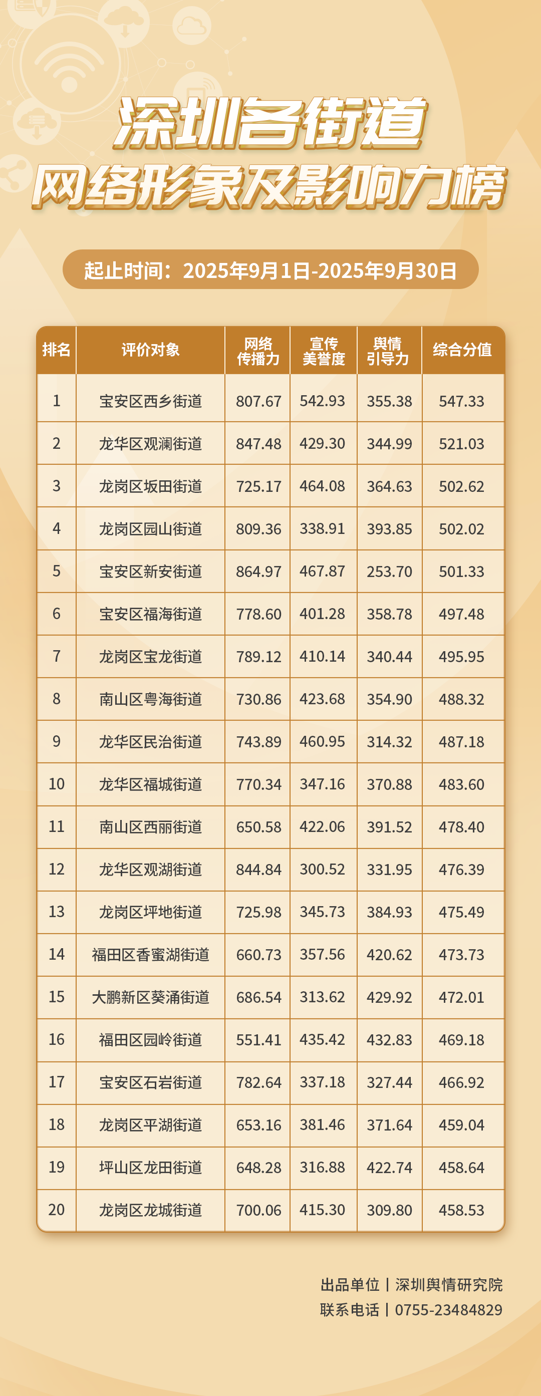 2025年9月,共有20個街道登上《深圳各街道網(wǎng)絡(luò)形象及影響力榜》,分別是:寶安區(qū)西鄉(xiāng)街道、龍華區(qū)觀瀾街道、龍崗區(qū)坂田街道、龍崗區(qū)園山街道、寶安區(qū)新安街道、寶安區(qū)福海街道、龍崗區(qū)寶龍街道、南山區(qū)粵海街道、龍華區(qū)民治街道、龍華區(qū)福城街道、南山區(qū)西麗街道、龍華區(qū)觀湖街道、龍崗區(qū)坪地街道、福田區(qū)香蜜湖街道、大鵬新區(qū)葵涌街道、福田區(qū)園嶺街道、寶安區(qū)石巖街道、龍崗區(qū)平湖街道、坪山區(qū)龍?zhí)锝值?、龍崗區(qū)龍城街道。