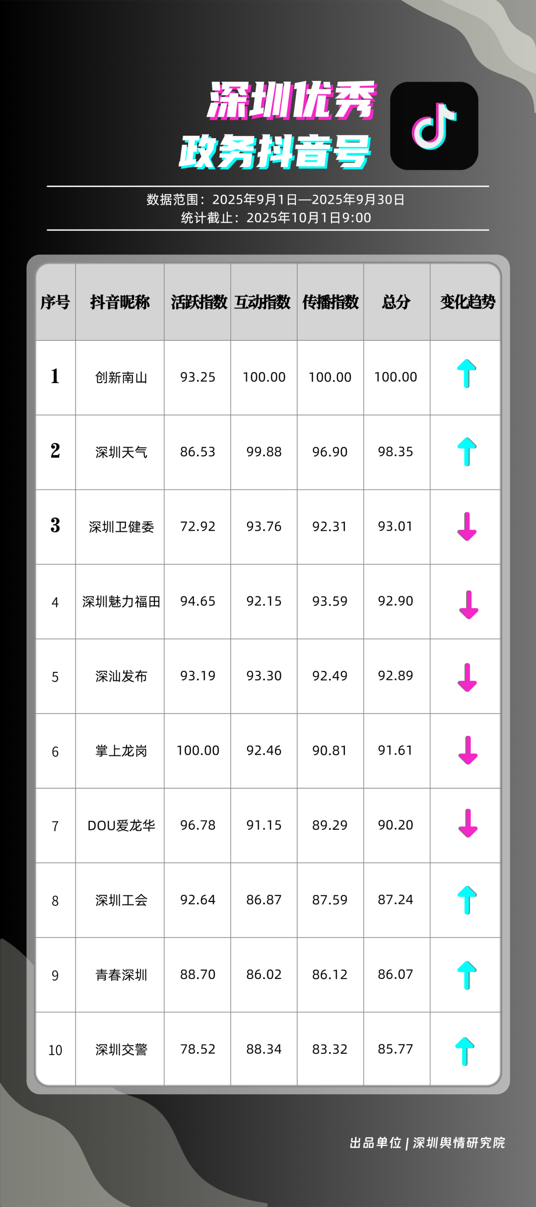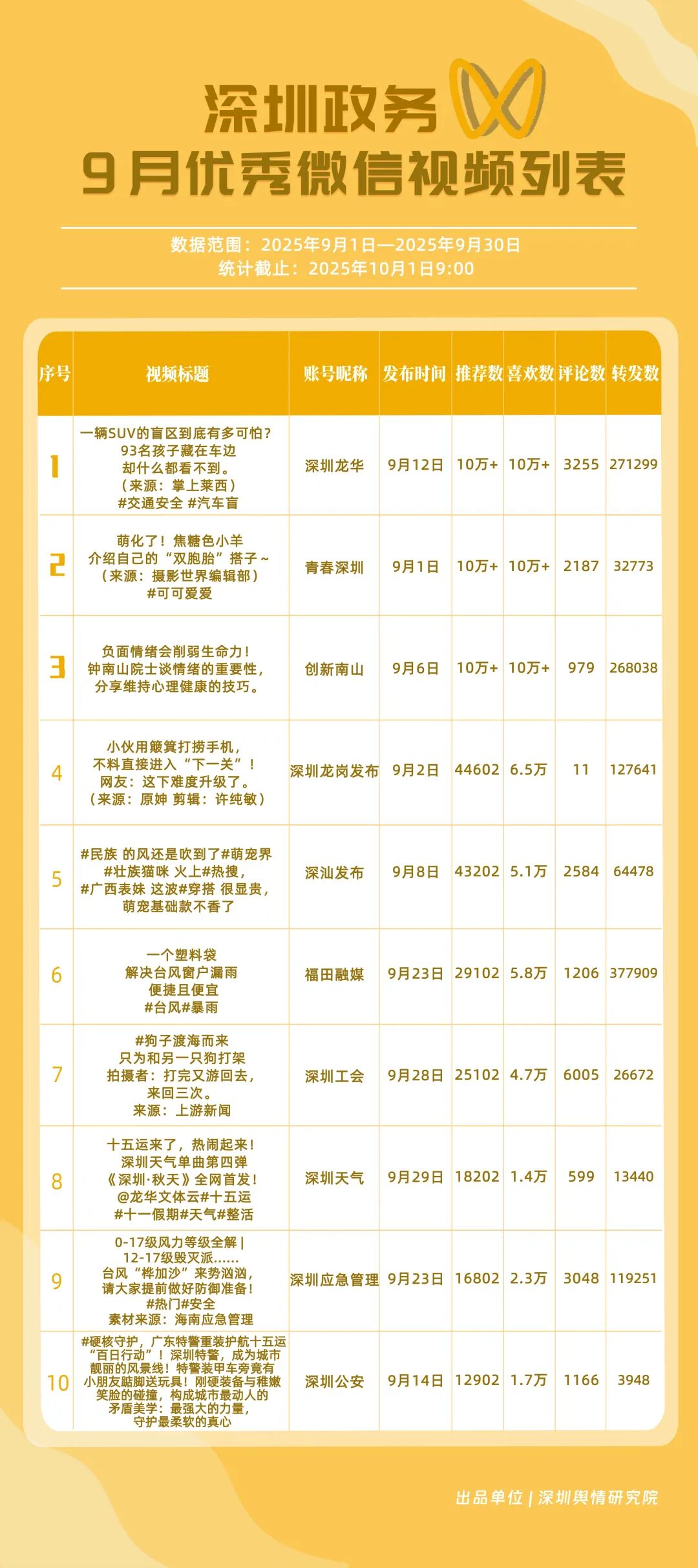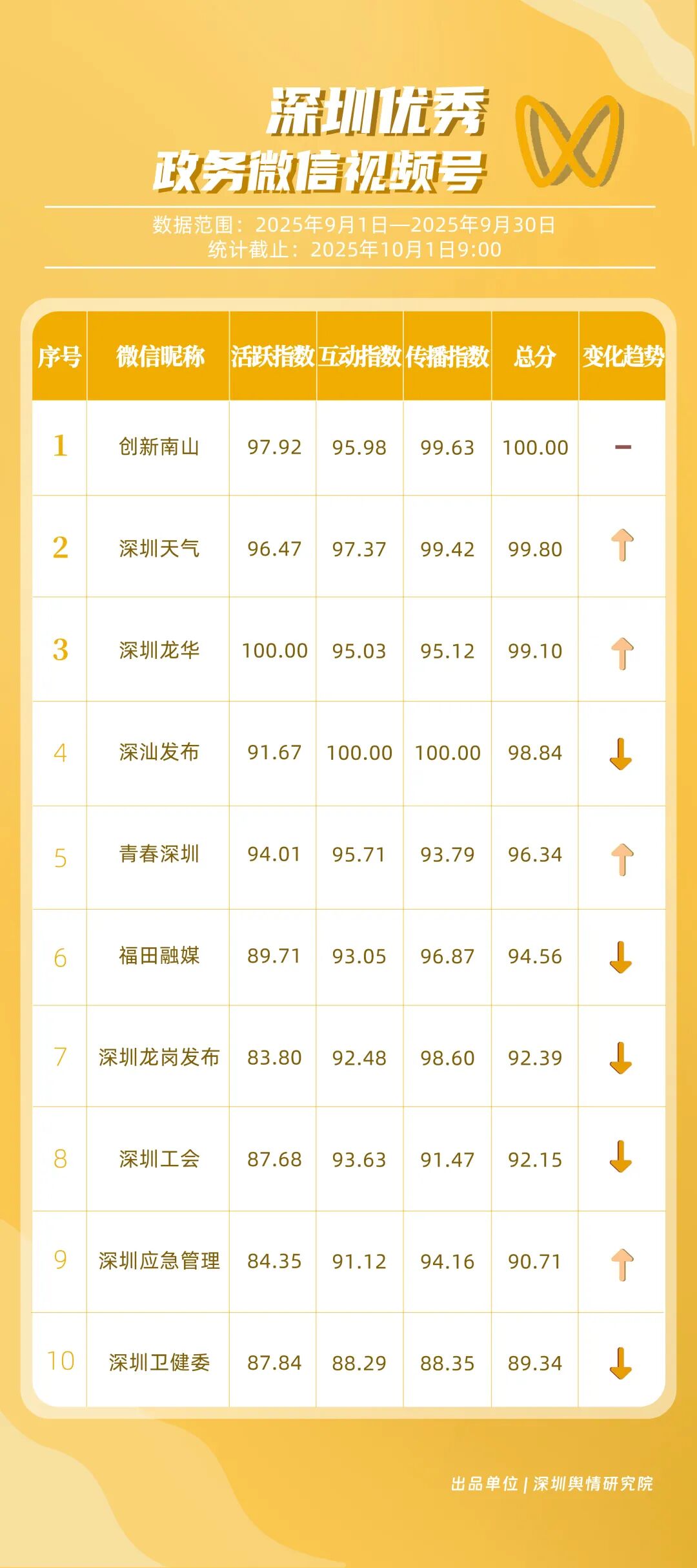 9月,深圳政務新媒體矩陣持續(xù)優(yōu)化內(nèi)容生態(tài),各單位依托平臺特色深化服務效能,南山區(qū)、市衛(wèi)生健康委員會、市氣象局(臺)、龍崗區(qū)、福田區(qū)、龍華區(qū)、深汕特別合作區(qū)、市應急管理局、中國共產(chǎn)主義青年團深圳市委員會、光明區(qū)的新媒體矩陣入選“深圳優(yōu)秀政務新媒體矩陣”榜單。9月,南山區(qū)在短視頻平臺表現(xiàn)突出,抖音、微信視頻號平臺均獲滿分;市衛(wèi)生健康委員會輸出深度內(nèi)容,位列榜單第二;市氣象局(臺)新媒體矩陣居于榜單第三,在9月發(fā)布臺風相關(guān)天氣提醒,獲得公眾廣泛關(guān)注。此外,龍崗區(qū)、福田區(qū)、龍華區(qū)、深汕特別合作區(qū)新媒體矩陣持續(xù)推出優(yōu)質(zhì)內(nèi)容,共同展現(xiàn)了深圳在塑造現(xiàn)代化形象、提升數(shù)字治理能力上的創(chuàng)新引領(lǐng)作用。
