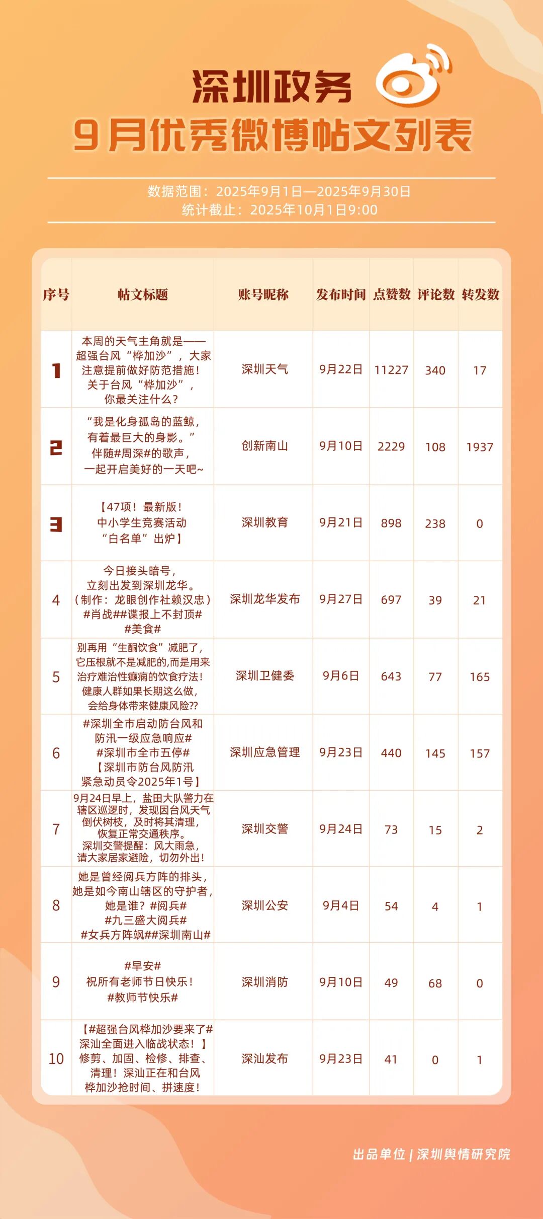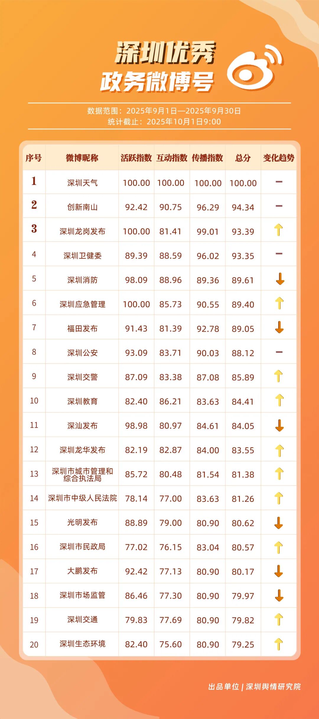 9月,20個賬號入選“優(yōu)秀政務微博號”榜單,其中包括:“深圳天氣”“創(chuàng)新南山”“深圳龍崗發(fā)布”“深圳衛(wèi)健委”“深圳消防”“深圳應急管理”“福田發(fā)布”“深圳公安”“深圳交警”“深圳教育”等。其中,“深圳天氣”蟬聯(lián)榜首,尤其9月出現(xiàn)臺風天氣,賬號受關(guān)注度再提升;“創(chuàng)新南山”賬號以多維度內(nèi)容策略實現(xiàn)傳播效能提升,其內(nèi)容中與歌手周深的聯(lián)動也成為一大亮點,獲得了較好傳播效果,以94.34分排名榜單第二;“深圳龍崗發(fā)布”“深圳衛(wèi)健委”兩賬號得分均在93分以上,在區(qū)域宣傳、內(nèi)容科普方向發(fā)力。上榜優(yōu)秀微博賬號展現(xiàn)出較高的內(nèi)容創(chuàng)新能力,以年輕化語態(tài)構(gòu)建傳播體系,形成兼具專業(yè)性與傳播力的優(yōu)秀案例。