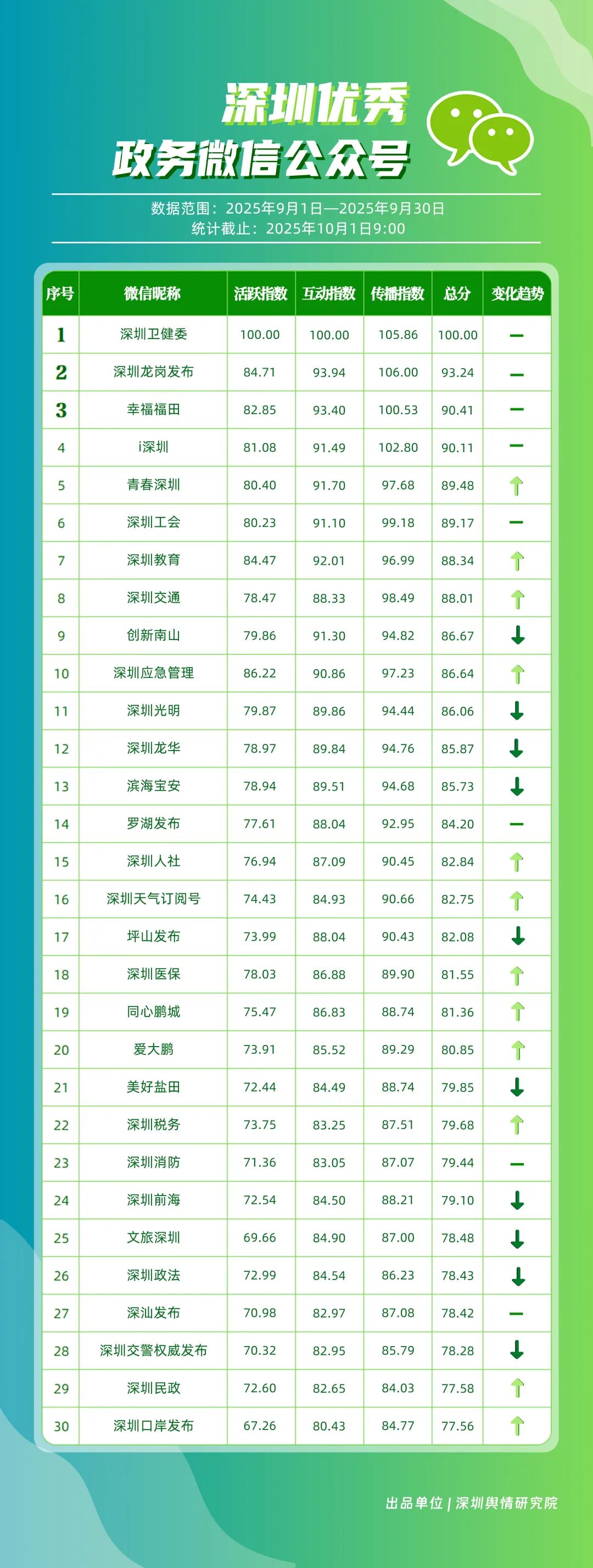 9月,“深圳衛(wèi)健委”“深圳龍崗發(fā)布”“幸福福田”“i深圳”“青春深圳”“深圳工會”“深圳教育”“深圳交通”“創(chuàng)新南山”“深圳應急管理”等30個政務微信公眾號榮登“深圳優(yōu)秀政務微信公眾號”榜單。9月,“深圳衛(wèi)健委”以總分100.00的成績蟬聯(lián)榜單首位,其憑借突破常規(guī)視角的選題,解讀專業(yè)健康知識,引發(fā)大量網(wǎng)民共鳴,內(nèi)容質(zhì)量與傳播力形成雙向賦能;“深圳龍崗發(fā)布”以總分93.24位居第二,聚焦區(qū)域民生服務升級等動態(tài),信息觸達率不斷提升;“幸福福田”圍繞商圈經(jīng)濟復蘇、文化節(jié)慶活動等主題開展系列宣傳,增強區(qū)域活力展示,位列第三;“i深圳”“青春深圳”“深圳工會”等也持續(xù)優(yōu)化賬號內(nèi)容,通過實用信息推送強化政務服務定位。