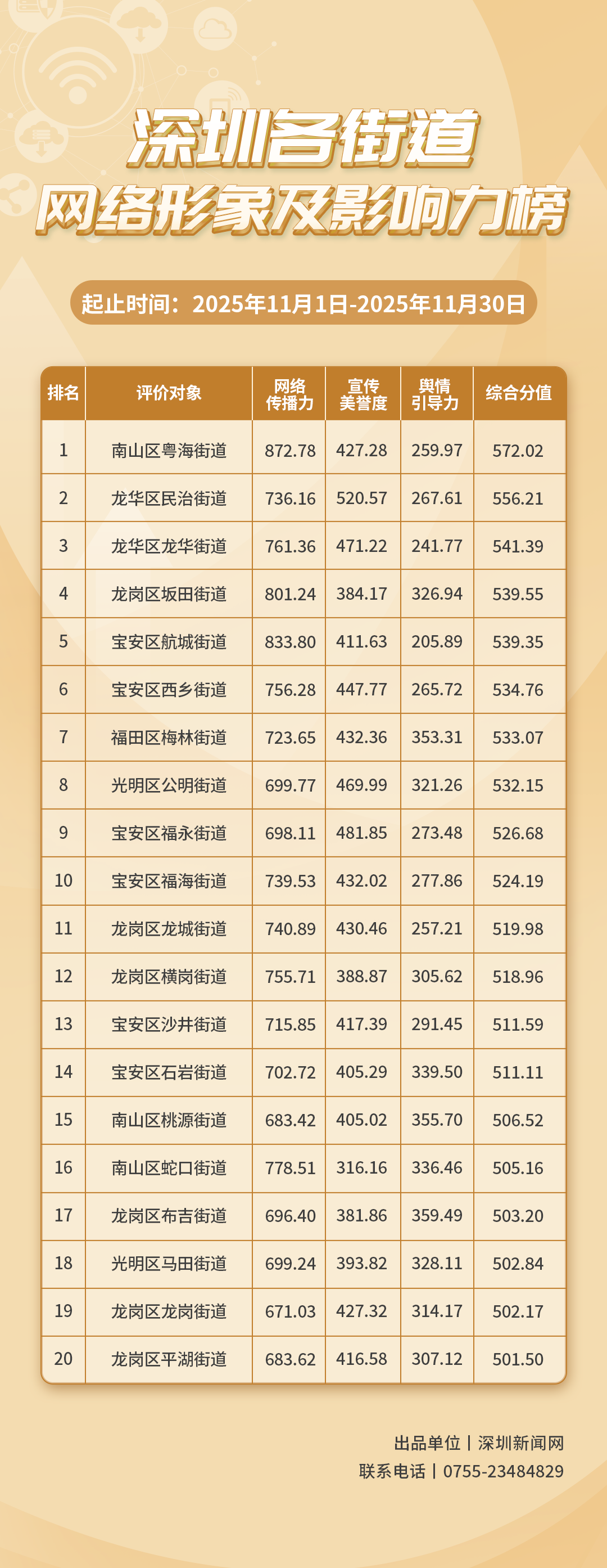 2025年11月,共有20個(gè)街道登上《深圳各街道網(wǎng)絡(luò)形象及影響力榜》,分別是:南山區(qū)粵海街道、龍華區(qū)民治街道、龍華區(qū)龍華街道、龍崗區(qū)坂田街道、寶安區(qū)航城街道、寶安區(qū)西鄉(xiāng)街道、福田區(qū)梅林街道、光明區(qū)公明街道、寶安區(qū)福永街道、寶安區(qū)福海街道、龍崗區(qū)龍城街道、龍崗區(qū)橫崗街道、寶安區(qū)沙井街道、寶安區(qū)石巖街道、南山區(qū)桃源街道、南山區(qū)蛇口街道、龍崗區(qū)布吉街道、光明區(qū)馬田街道、龍崗區(qū)龍崗街道、龍崗區(qū)平湖街道。