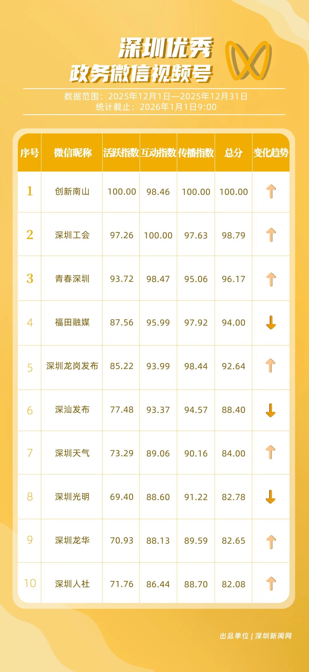 12月,“創(chuàng)新南山”“深圳工會”“青春深圳”“福田融媒”“深圳龍崗發(fā)布”“深汕發(fā)布”“深圳天氣”“深圳光明”“深圳龍華”“深圳人社”榮獲“優(yōu)秀政務(wù)微信視頻號”稱號。“創(chuàng)新南山”活躍指數(shù)、傳播指數(shù)均獲滿分,月作品總轉(zhuǎn)發(fā)量超70萬,領(lǐng)跑榜單;“深圳工會”積極發(fā)布熱點、民生類內(nèi)容,精準(zhǔn)對接市民需求,排名上升至第二名;“青春深圳”互動指數(shù)超98分,以高互動量位列榜單第三名?!案L锶诿健薄吧钲邶垗彴l(fā)布”兩賬號立足區(qū)域特色深耕內(nèi)容,得分超90分。上榜微信視頻號以輕量化短視頻為載體,傳播公眾喜聞樂見的政務(wù)、民生內(nèi)容,打造出兼具傳播力與親和力的政務(wù)宣傳新名片。