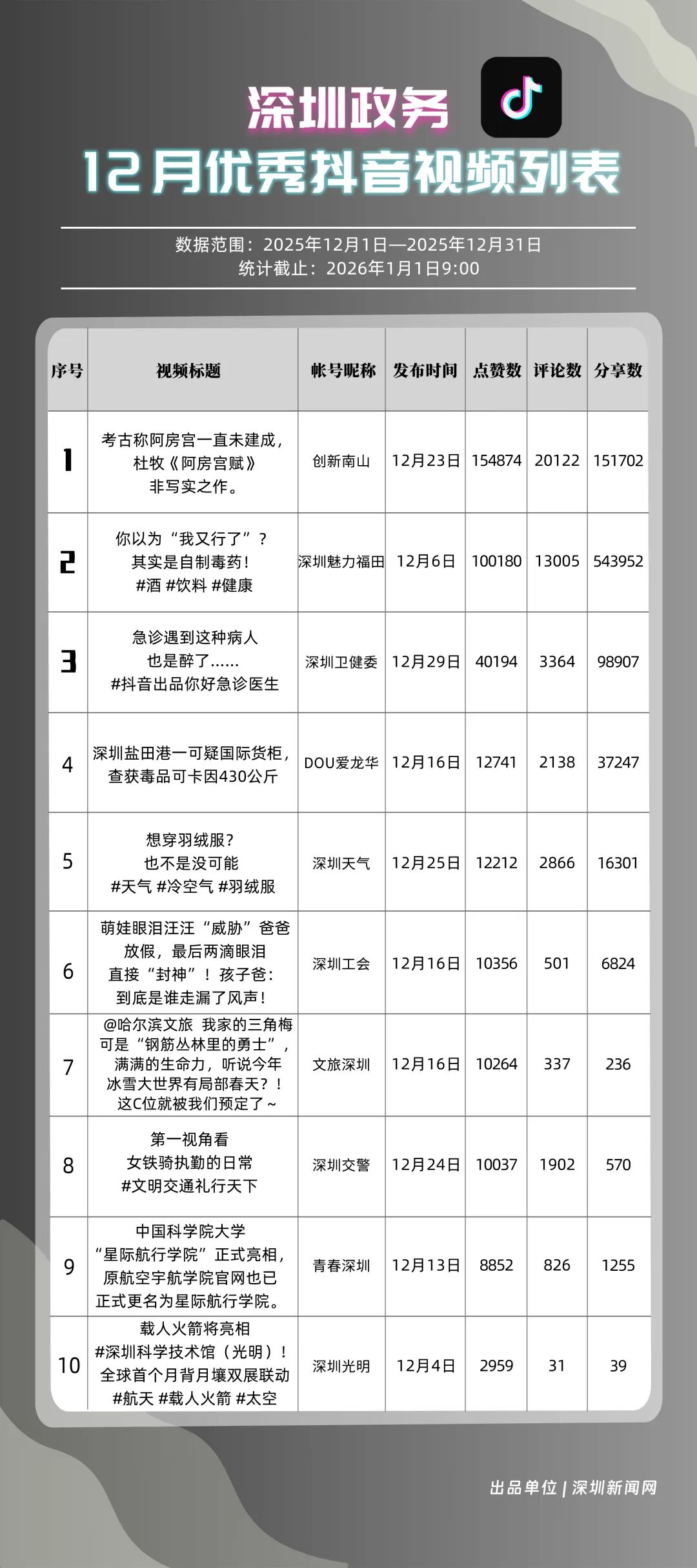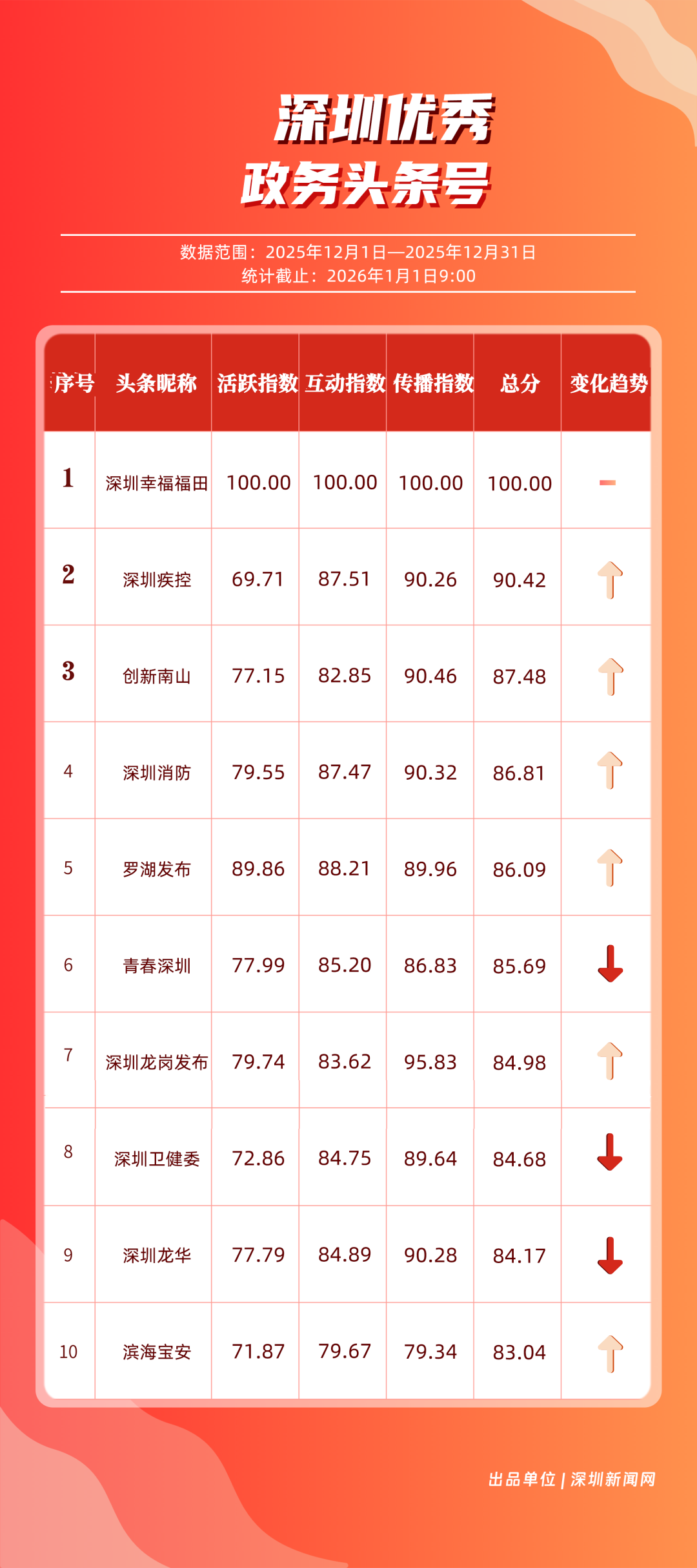 12月,深圳政務(wù)新媒體矩陣持續(xù)深耕內(nèi)容生態(tài),各單位依托平臺特色深化服務(wù)效能,南山區(qū)、福田區(qū)、市衛(wèi)生健康委員會、市總工會、龍崗區(qū)、市氣象局(臺)、光明區(qū)、中國共產(chǎn)主義青年團(tuán)深圳市委員會、龍華區(qū)、深汕特別合作區(qū)的新媒體矩陣入選“深圳優(yōu)秀政務(wù)新媒體矩陣”榜單。12月,南山區(qū)新媒體矩陣中,“創(chuàng)新南山”賬號在抖音平臺保持高質(zhì)量創(chuàng)作態(tài)勢,單賬號單月視頻總點贊量突破120萬,視頻號平臺同樣表現(xiàn)亮眼,單月視頻總轉(zhuǎn)發(fā)量超70萬,憑借雙平臺滿分的傳播表現(xiàn),位居榜單首位;福田區(qū)新媒體矩陣表現(xiàn)均衡穩(wěn)定,在各平臺得分均在92分以上,以93.94分的總成績位列第二;市衛(wèi)生健康委員會新媒體矩陣在微信公眾號持續(xù)輸出專業(yè)優(yōu)質(zhì)內(nèi)容,在該平臺獲得滿分,助力其以92.21分的總分排名第三位。此外,市總工會、龍崗區(qū)新媒體矩陣總分均超90分,以“各美其美”的發(fā)展態(tài)勢,展現(xiàn)深圳政務(wù)新媒體矩陣的蓬勃生機。