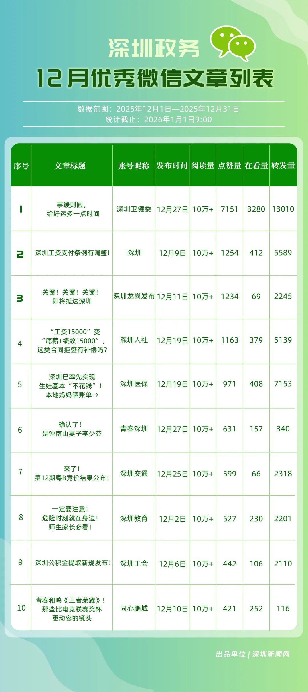 12月,“深圳衛(wèi)健委”“深圳龍崗發(fā)布”“幸福福田”“i深圳”“青春深圳”“深圳光明”“深圳工會”“創(chuàng)新南山”“深圳龍華”“羅湖發(fā)布”等30個政務(wù)微信公眾號榮登“深圳優(yōu)秀政務(wù)微信公眾號”榜單。12月榜單中,頭部政務(wù)賬號優(yōu)勢穩(wěn)固,腰部賬號競爭激烈?!吧钲谛l(wèi)健委”延續(xù)強勁表現(xiàn),在活躍、互動、傳播維度均斬獲滿分,60余篇文章閱讀超10萬,蟬聯(lián)榜首;“深圳龍崗發(fā)布”在互動、傳播方面表現(xiàn)亮眼,穩(wěn)居榜單第二;“幸福福田”也在互動、傳播方面具備一定優(yōu)勢,以穩(wěn)定的內(nèi)容輸出與用戶口碑,居于榜單第三?!吧钲诠饷鳌薄吧钲邶埲A”“羅湖發(fā)布”等政務(wù)賬號不斷拓展信息發(fā)布維度、深化服務(wù)場景打造,排名較上期有所提升。上榜微信公眾號以高質(zhì)量內(nèi)容為核心競爭力,在政務(wù)傳播賽道持續(xù)發(fā)力,為推動政務(wù)信息公開、服務(wù)民生需求搭建了高效的溝通橋梁。