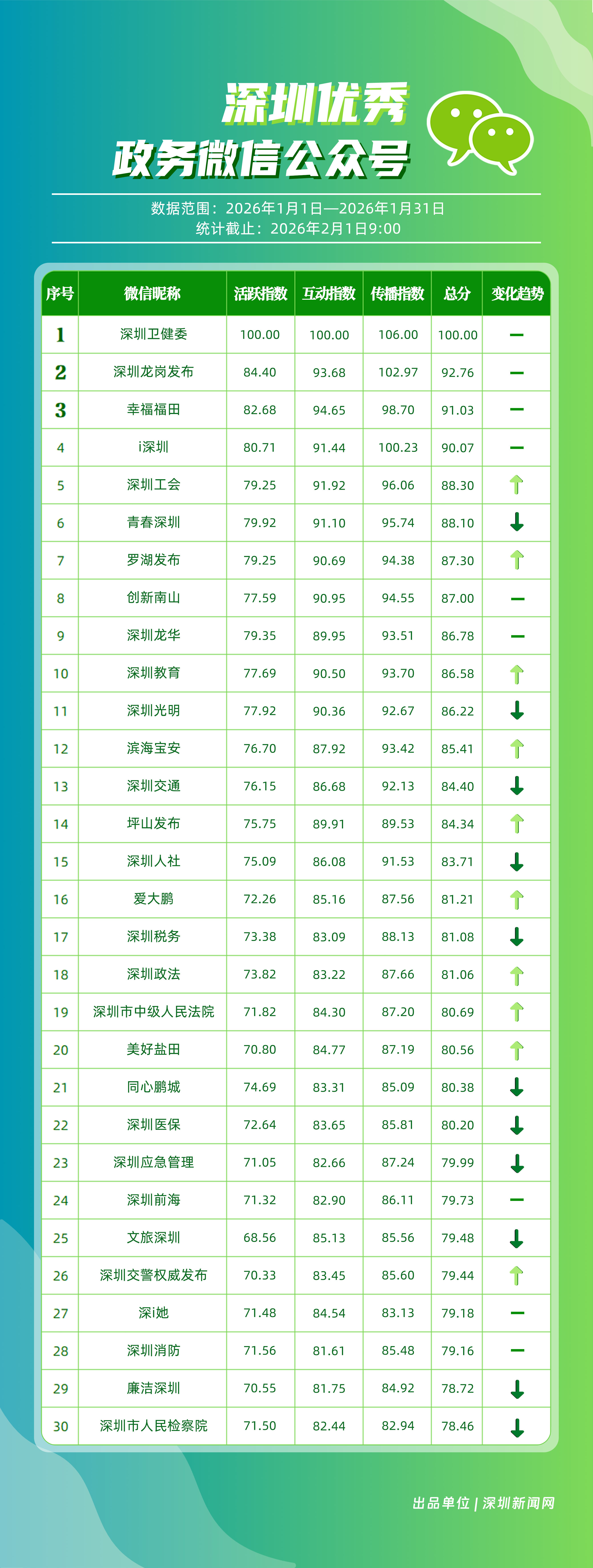2026年1月,“深圳衛(wèi)健委”“深圳龍崗發(fā)布”“幸福福田”“i深圳”“深圳工會(huì)”“青春深圳”“羅湖發(fā)布”“創(chuàng)新南山”“深圳龍華”“深圳教育”等30個(gè)政務(wù)微信公眾號(hào)榮登“深圳優(yōu)秀政務(wù)微信公眾號(hào)”榜單。1月,頭部賬號(hào)“深圳衛(wèi)健委”繼續(xù)保持領(lǐng)先優(yōu)勢(shì),1月份有59篇文章閱讀量突破10萬次,總分100分,穩(wěn)居榜首;“深圳龍崗發(fā)布”在互動(dòng)與傳播方面表現(xiàn)依然出色,總分102.97分,位列第二;“幸福福田”憑借均衡、穩(wěn)健的運(yùn)營,在互動(dòng)與傳播方面表現(xiàn)優(yōu)異,總分91.03分,排名第三。同時(shí),“深圳工會(huì)”與“羅湖發(fā)布”等賬號(hào)排名相較2025年12月有所提升。上榜微信公眾號(hào)持續(xù)深耕內(nèi)容與服務(wù),不斷拓展發(fā)布維度與深化應(yīng)用場(chǎng)景,在提升政務(wù)信息傳播效能、精準(zhǔn)對(duì)接民生需求方面,發(fā)揮了關(guān)鍵作用。