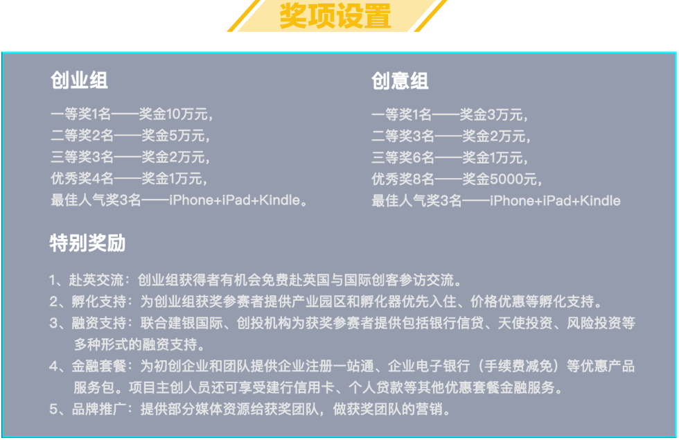 藍色夢工廠創(chuàng)客大賽由中國建設銀行深圳市分行、深圳國家高技術(shù)產(chǎn)業(yè)創(chuàng)新中心和建銀國際聯(lián)合主辦,積極響應國家大眾創(chuàng)業(yè)萬眾創(chuàng)新,支持深圳的創(chuàng)客們實現(xiàn)夢想。大賽組委會將邀請創(chuàng)業(yè)專家、科技專家、風險投資專家等對參賽項目的商業(yè)前景、創(chuàng)新性、成長性以及團隊素質(zhì)等維度進行綜合考察。我們將為獲獎創(chuàng)客團隊提供豐厚獎金、融資支持、初創(chuàng)企業(yè)金融套餐、免費赴英國開展企業(yè)參訪交流、高新區(qū)孵化器場地優(yōu)先入駐、價格優(yōu)惠以及媒體曝光、品牌推廣等多項支持。