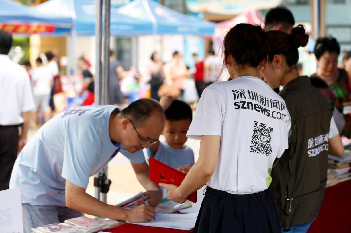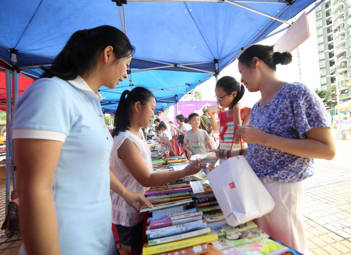老爸帶著孩子來到活動現(xiàn)場捐書