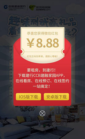 5、當(dāng)?shù)梅殖^(guò) 300 分時(shí),即有機(jī)會(huì)獲得由建設(shè)銀行提供的微信現(xiàn)金紅包一份,活動(dòng)期間,每位用戶僅限領(lǐng)取一次。