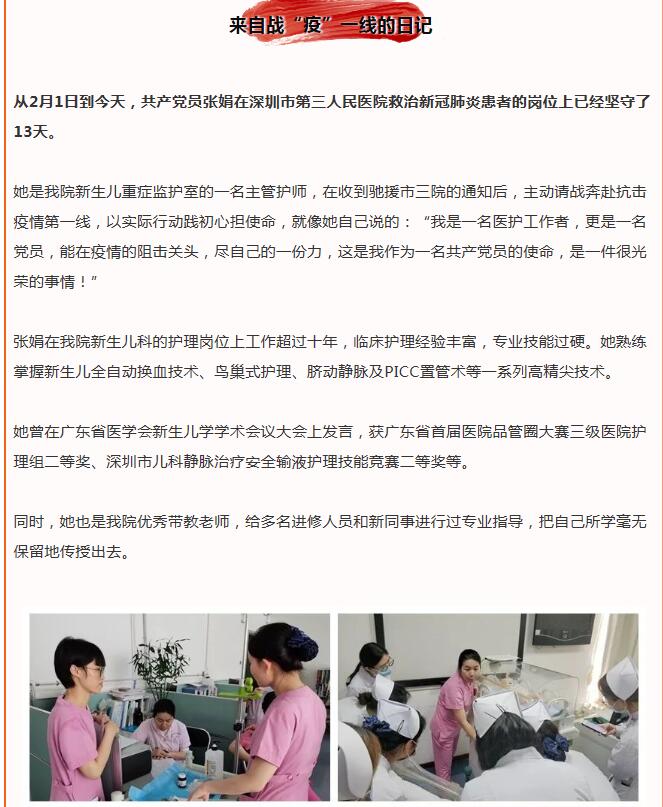 賴碧娟是深圳市婦幼保健院急診黨支部書記、急診科護(hù)士長(zhǎng)。作為一名老黨員,抱著“疫情快些得到控制,最大程度減少損失”的信念,新冠肺炎疫情期間,她帶頭沖在一線,整個(gè)春節(jié)期間基本都在醫(yī)院加班。[詳細(xì)]